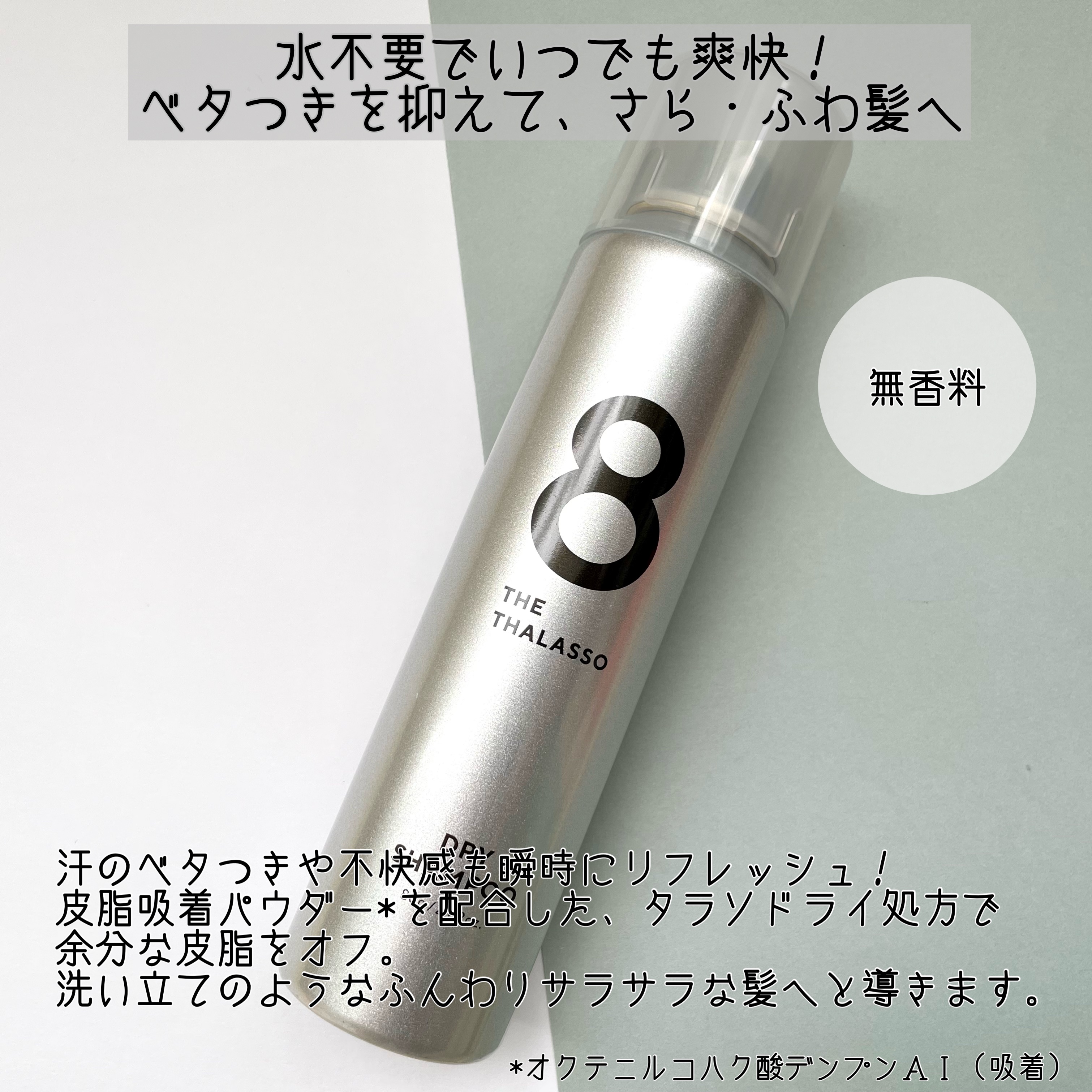 - 髪にもボディにも使えるドライシャンプー。シーン問わず使いやすい無香料タイプ。 水不要で汗のベタつきや不快感も瞬時にリフレッシュ。皮脂吸着パウダー*を配合した、タラソドライ処方で余分な皮脂をオフして、洗い立てのようなふんわりサラサラな髪へと導きます。 皮脂や汗などによるベタつきのケアやペタンコ前髪のリメイクにもおすすめです。 * オクテニルコハク酸デンプンAI(吸着)