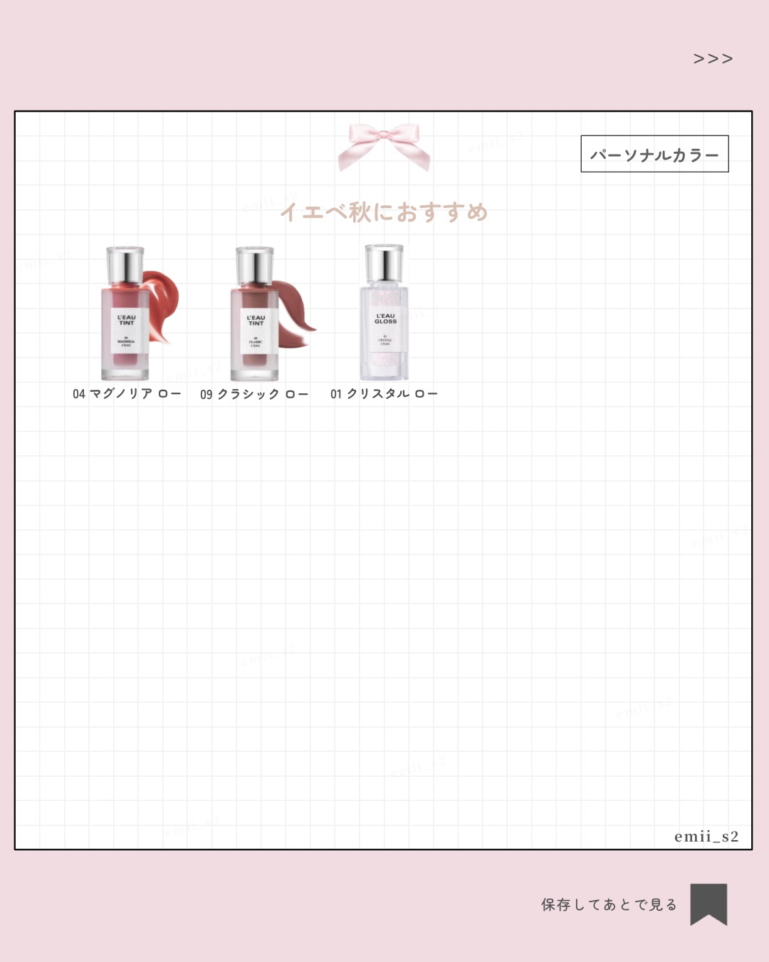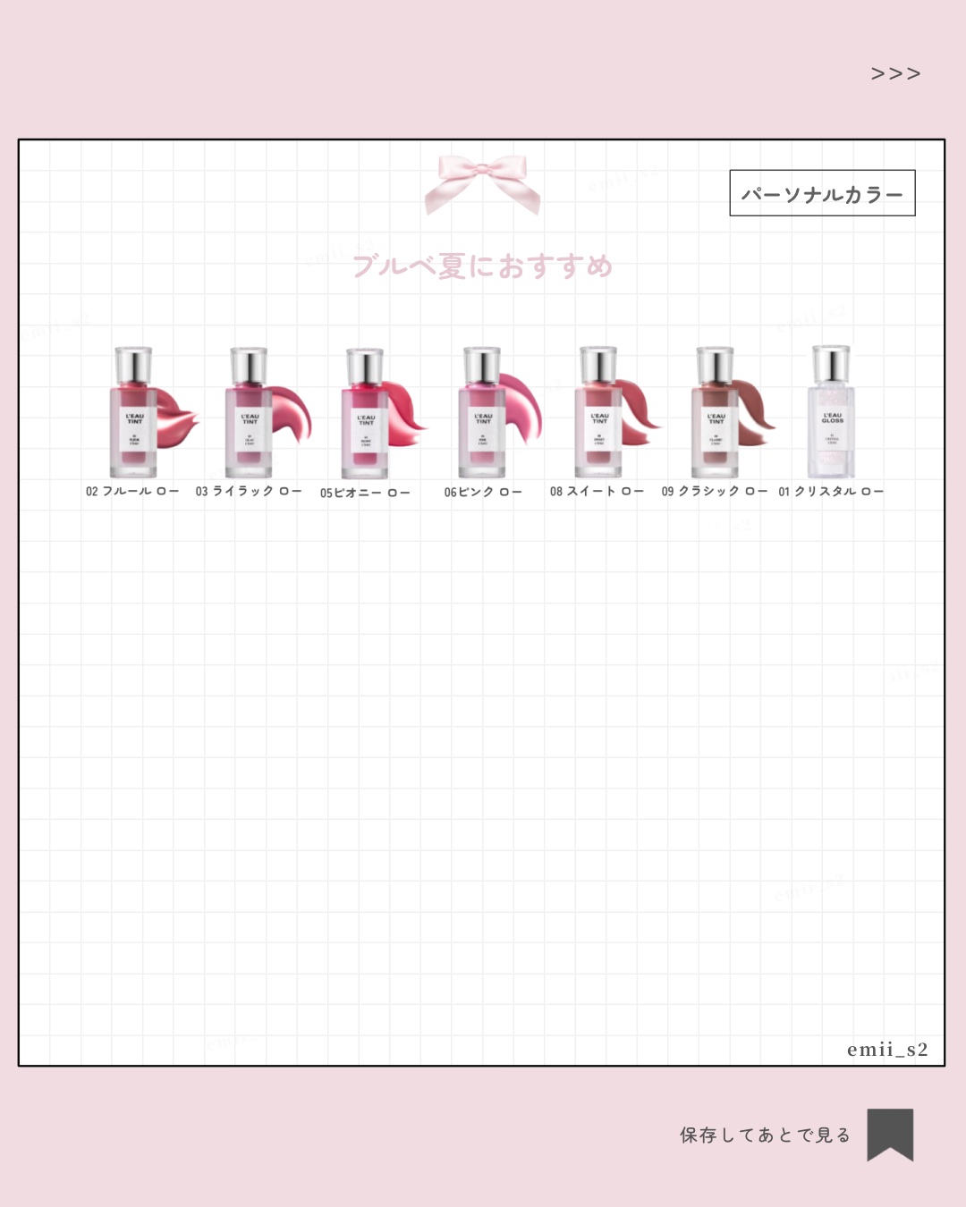 - <01 ガーデニア・ロー> 水、ジフェニルジメチコン、ビスジグリセリルポリアシルアジペート-2、リンゴ酸ジイソステアリル、グリセリン、DPG、セチルPEG/PPG-10/1ジメチコン、1,2-ヘキサンジオール、ポリソルベート60、イソステアリン酸ソルビタン、(アクリル酸ヒドロキシエチル/アクリロイルジメチルタウリンNa)コポリマー、セテアレス-20、スクワラン、酸化チタン、黄5、香料、エチルヘキシルグリセリン、赤227、青1、BG、ヤマザクラ花エキス、モクレン花エキス、ハス花エキス、ダマスクバラ花エキス、クエン酸Na、テトラ(ジ-t-ブチルヒドロキシヒドロケイヒ酸)ペンタエリスリチル、クエン酸、フェノキシエタノール <02 フルール・ロー> 水、ジフェニルジメチコン、ビスジグリセリルポリアシルアジペート-2、リンゴ酸ジイソステアリル、グリセリン、DPG、セチルPEG/PPG-10/1ジメチコン、1,2-ヘキサンジオール、ポリソルベート60、イソステアリン酸ソルビタン、(アクリル酸ヒドロキシエチル/アクリロイルジメチルタウリンNa)コポリマー、セテアレス-20、スクワラン、酸化チタン、香料、エチルヘキシルグリセリン、赤227、黄4、黄5、赤104(1)、青1、BG、ヤマザクラ花エキス、モクレン花エキス、ハス花エキス、ダマスクバラ花エキス、クエン酸Na、テトラ(ジ-t-ブチルヒドロキシヒドロケイヒ酸)ペンタエリスリチル、クエン酸、フェノキシエタノール <03 ライラック・ロー> 水、ジフェニルジメチコン、ビスジグリセリルポリアシルアジペート-2、リンゴ酸ジイソステアリル、グリセリン、DPG、セチルPEG/PPG-10/1ジメチコン、1,2-ヘキサンジオール、ポリソルベート60、イソステアリン酸ソルビタン、(アクリル酸ヒドロキシエチル/アクリロイルジメチルタウリンNa)コポリマー、セテアレス-20、スクワラン、酸化チタン、香料、エチルヘキシルグリセリン、赤227、黄5、青1、BG、ヤマザクラ花エキス、モクレン花エキス、ハス花エキス、ダマスクバラ花エキス、クエン酸Na、テトラ(ジ-t-ブチルヒドロキシヒドロケイヒ酸)ペンタエリスリチル、クエン酸、フェノキシエタノール <04 マグノリア・ロー> 水、ジフェニルジメチコン、ビスジグリセリルポリアシルアジペート-2、リンゴ酸ジイソステアリル、グリセリン、DPG、セチルPEG/PPG-10/1ジメチコン、1,2-ヘキサンジオール、ポリソルベート60、イソステアリン酸ソルビタン、(アクリル酸ヒドロキシエチル/アクリロイルジメチルタウリンNa)コポリマー、セテアレス-20、スクワラン、酸化チタン、香料、エチルヘキシルグリセリン、赤227、黄4、黄5、青1、BG、ヤマザクラ花エキス、モクレン花エキス、ハス花エキス、ダマスクバラ花エキス、クエン酸Na、テトラ(ジ-t-ブチルヒドロキシヒドロケイヒ酸)ペンタエリスリチル、クエン酸、フェノキシエタノール <05 ピオニー・ロー> 水、ジフェニルジメチコン、ビスジグリセリルポリアシルアジペート-2、リンゴ酸ジイソステアリル、グリセリン、DPG、セチルPEG/PPG-10/1ジメチコン、1,2-ヘキサンジオール、ポリソルベート60、イソステアリン酸ソルビタン、(アクリル酸ヒドロキシエチル/アクリロイルジメチルタウリンNa)コポリマー、セテアレス-20、スクワラン、香料、エチルヘキシルグリセリン、黄5、赤227、赤104(1)、BG、ヤマザクラ花エキス、モクレン花エキス、ハス花エキス、ダマスクバラ花エキス、クエン酸Na、テトラ(ジ-t-ブチルヒドロキシヒドロケイヒ酸)ペンタエリスリチル、クエン酸、フェノキシエタノール <06 ピンク・ロー> 水、ジフェニルジメチコン、ビスジグリセリルポリアシルアジペート-2、リンゴ酸ジイソステアリル、グリセリン、DPG、セチルPEG/PPG-10/1ジメチコン、1,2-ヘキサンジオール、ポリソルベート60、イソステアリン酸ソルビタン、(アクリル酸ヒドロキシエチル/アクリロイルジメチルタウリンNa)コポリマー、セテアレス-20、スクワラン、酸化チタン、香料、エチルヘキシルグリセリン、黄5、赤104(1)、赤227、青1、BG、ヤマザクラ花エキス、モクレン花エキス、ハス花エキス、ダマスクバラ花エキス、クエン酸Na、テトラ(ジ-t-ブチルヒドロキシヒドロケイヒ酸)ペンタエリスリチル、クエン酸、フェノキシエタノール <07 ピーチ・ロー> 水、ジフェニルジメチコン、ビスジグリセリルポリアシルアジペート-2、リンゴ酸ジイソステアリル、グリセリン、DPG、セチルPEG/PPG-10/1ジメチコン、1,2-ヘキサンジオール、ポリソルベート60、イソステアリン酸ソルビタン、(アクリル酸ヒドロキシエチル/アクリロイルジメチルタウリンNa)コポリマー、セテアレス-20、スクワラン、酸化チタン、香料、エチルヘキシルグリセリン、黄4、赤227、黄5、赤104(1)、BG、ヤマザクラ花エキス、モクレン花エキス、ハス花エキス、ダマスクバラ花エキス、クエン酸Na、テトラ(ジ-t-ブチルヒドロキシヒドロケイヒ酸)ペンタエリスリチル、クエン酸、フェノキシエタノール <08 スイート・ロー> 水、ジフェニルジメチコン、ビスジグリセリルポリアシルアジペート-2、リンゴ酸ジイソステア