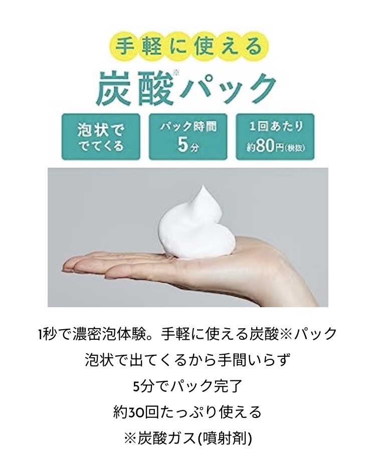 - ビタミンC誘導体(*1)配合、高濃度(*2)の炭酸(*3)泡で透明感のある肌へ導く炭酸美容パック。 マッサージで血行促進、くすみ(*4)やざらつきも洗い流します。 スカルプパックとして頭皮にもご使用頂けます。 *1 リン酸アスコルビルMg(整肌)、ビスグリセリルアスコルビン酸(整肌)、テトラヘキシルデカン酸アスコルビル(整肌) *2 自社従来品比 *3 炭酸ガス(噴射剤) *4古い角質による