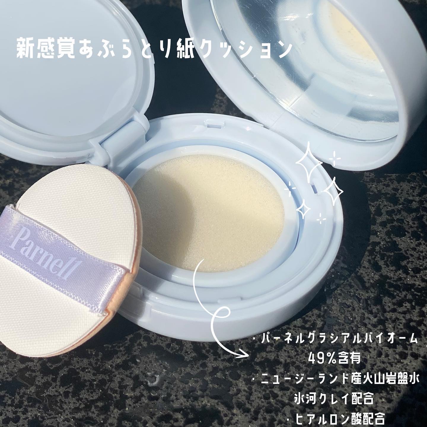 Parnell˚✦テカリが気になる部位にポンポン新感覚あぶらとり紙クッション🤍✔︎WaterNoSebumCushion#ウォーターノーセバムクッション¥2,850[Qoo10公式価格]ニュージーランドの火山岩層水が豊富なミネラル成分と水分を...