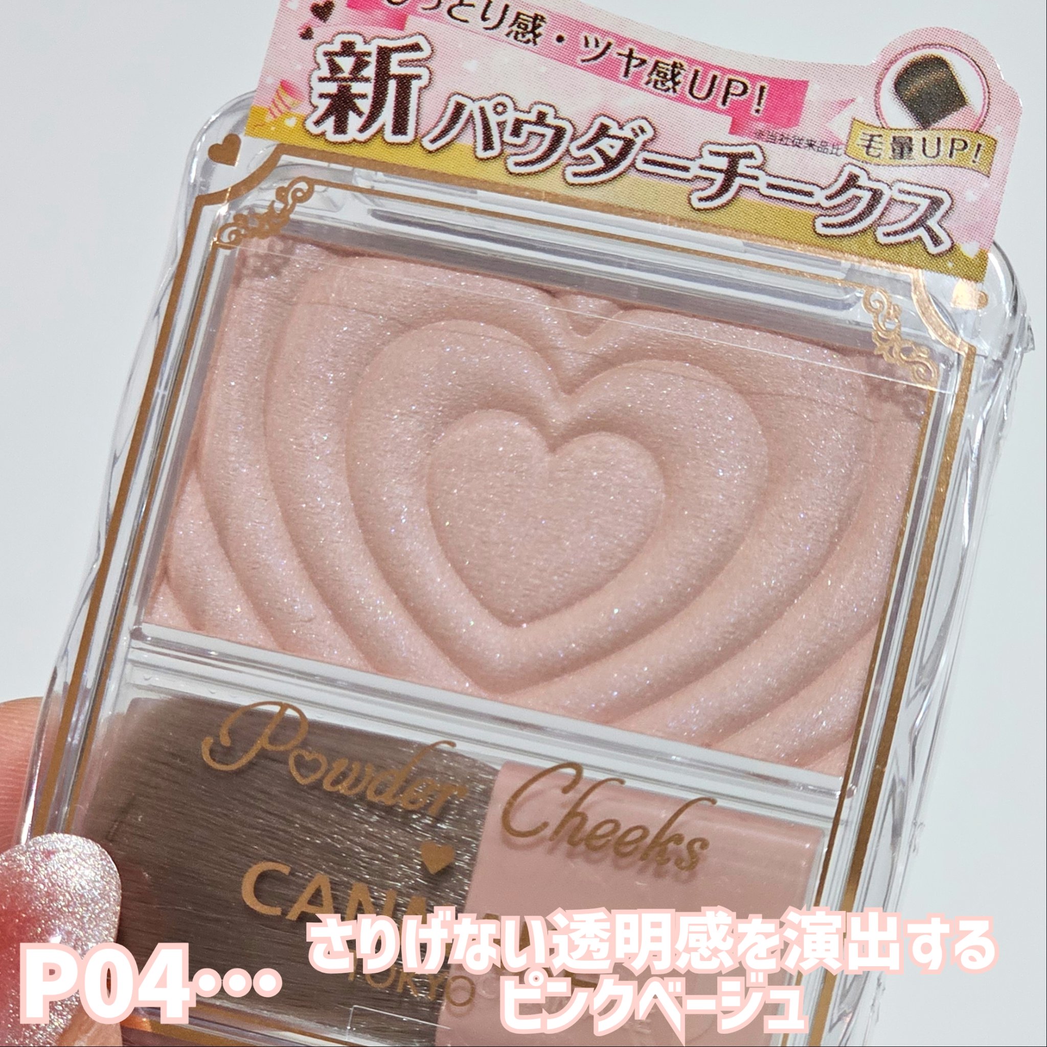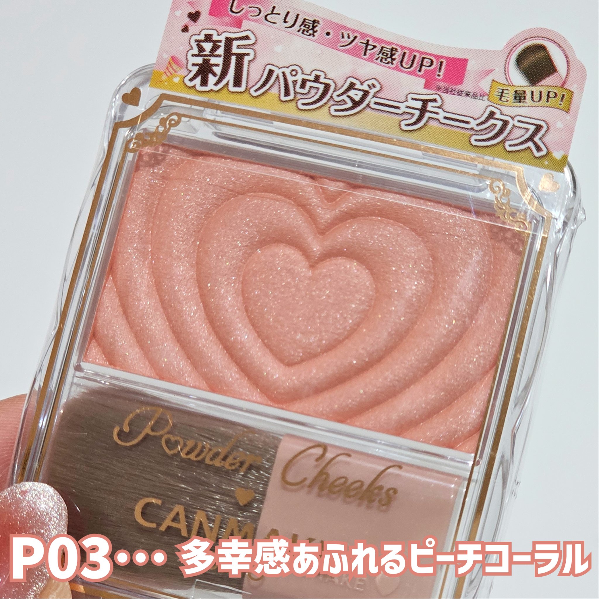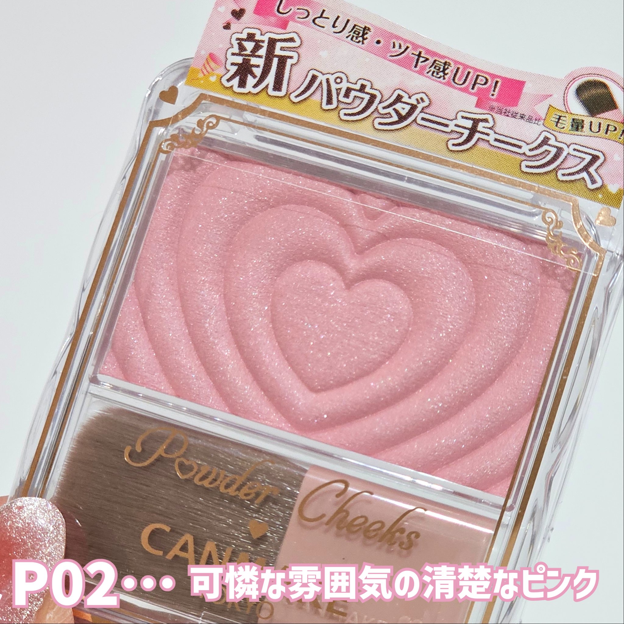 - 生まれ変わった、新・パウダーチークス! クリアな発色でしっとり溶け込むようなツヤ感単色チーク♡ 1.デザインがさらに可愛く♡ 使うたびにキュンとしちゃうハートデザイン♪ 2. 中身がもっと魅力的に ・しっとり感UP!※ ムラになりにくいクリアな発色 ・パール感がさらに繊細に!※ 溶け込むような自然なツヤ感です♪ 3. ブラシの毛量UP※ 広範囲に広げやすいふんわりブラシに進化! ※当社従来品比