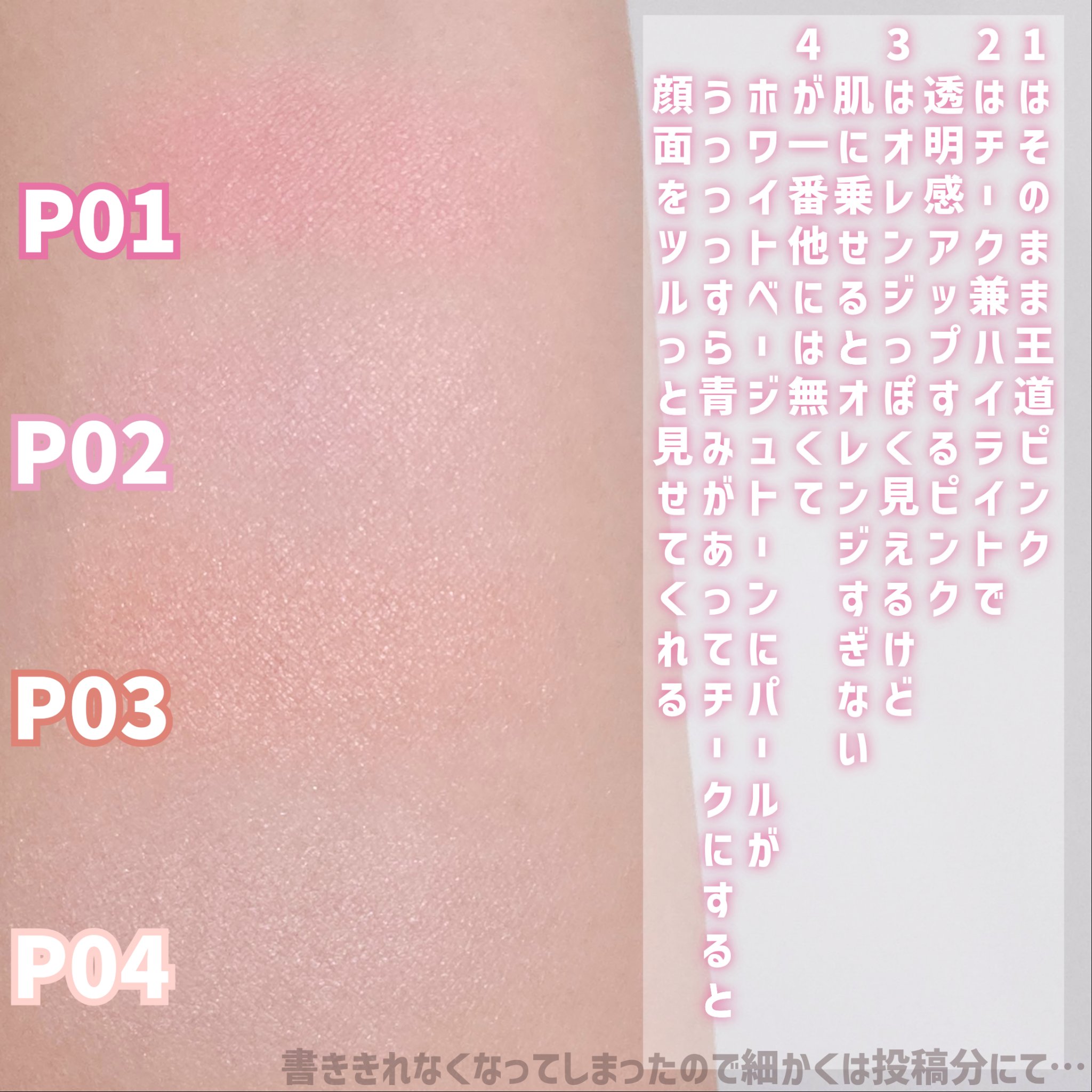 - <P01 パワフルピンク> タルク、リンゴ酸ジイソステアリル、合成フルオロフロゴパイト、トリエチルヘキサノイン、イソステアリン酸水添ヒマシ油、ポリグリセリル-3ポリジメチルシロキシエチルジメチコン、ラウリン酸亜鉛、メチルパラベン、酸化スズ、トコフェロール、オリーブ果実油、カニナバラ果実油、セラミドNP、シア脂、ホホバ種子油、マイカ、グンジョウ、酸化チタン、酸化鉄、赤202、赤226 <P02 リトルシャイピンク> タルク、リンゴ酸ジイソステアリル、トリエチルヘキサノイン、イソステアリン酸水添ヒマシ油、ポリグリセリル-3ポリジメチルシロキシエチルジメチコン、ラウリン酸亜鉛、メチルパラベン、トコフェロール、オリーブ果実油、カニナバラ果実油、セラミドNP、シア脂、ホホバ種子油、マイカ、グンジョウ、酸化チタン、水酸化Al、酸化鉄、赤226 <P03 チアフルピーチ> タルク、リンゴ酸ジイソステアリル、トリエチルヘキサノイン、イソステアリン酸水添ヒマシ油、ポリグリセリル-3ポリジメチルシロキシエチルジメチコン、ラウリン酸亜鉛、合成フルオロフロゴパイト、メチルパラベン、トコフェロール、オリーブ果実油、カニナバラ果実油、セラミドNP、シア脂、ホホバ種子油、酸化スズ、マイカ、酸化チタン、酸化鉄、赤226 <P04 クレバーベージュ> タルク、リンゴ酸ジイソステアリル、トリエチルヘキサノイン、イソステアリン酸水添ヒマシ油、ポリグリセリル-3ポリジメチルシロキシエチルジメチコン、ラウリン酸亜鉛、メチルパラベン、トコフェロール、オリーブ果実油、カニナバラ果実油、セラミドNP、シア脂、ホホバ種子油、マイカ、グンジョウ、酸化チタン、酸化鉄、赤226 <P05 クラッシーモーヴピンク> タルク、リンゴ酸ジイソステアリル、トリエチルヘキサノイン、イソステアリン酸水添ヒマシ油、ポリグリセリル-3ポリジメチルシロキシエチルジメチコン、ラウリン酸亜鉛、メチルパラベン、トコフェロール、オリーブ果実油、カニナバラ果実油、セラミドNP、シア脂、ホホバ種子油、マイカ、酸化鉄、酸化チタン、水酸化Al、グンジョウ、赤226 <P40thx キューティーベリー> タルク、リンゴ酸ジイソステアリル、トリエチルヘキサノイン、イソステアリン酸水添ヒマシ油、合成フルオロフロゴパイト、ポリグリセリル-3ポリジメチルシロキシエチルジメチコン、ラウリン酸亜鉛、メチルパラベン、トコフェロール、オリーブ果実油、カニナバラ果実油、セラミドNP、シア脂、ホホバ種子油、マイカ、酸化チタン、赤226、グンジョウ、酸化鉄、水酸化Al