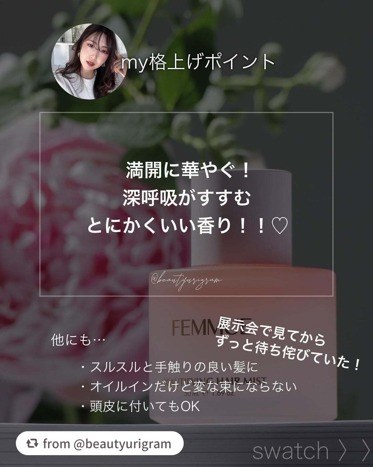 | ヘアケア・スタイリングランキング第53位 | ヘアミストなのできつすぎず、ふわ~っと優しいフローラルな匂いが漂います🍃 | 詳細を見る | |