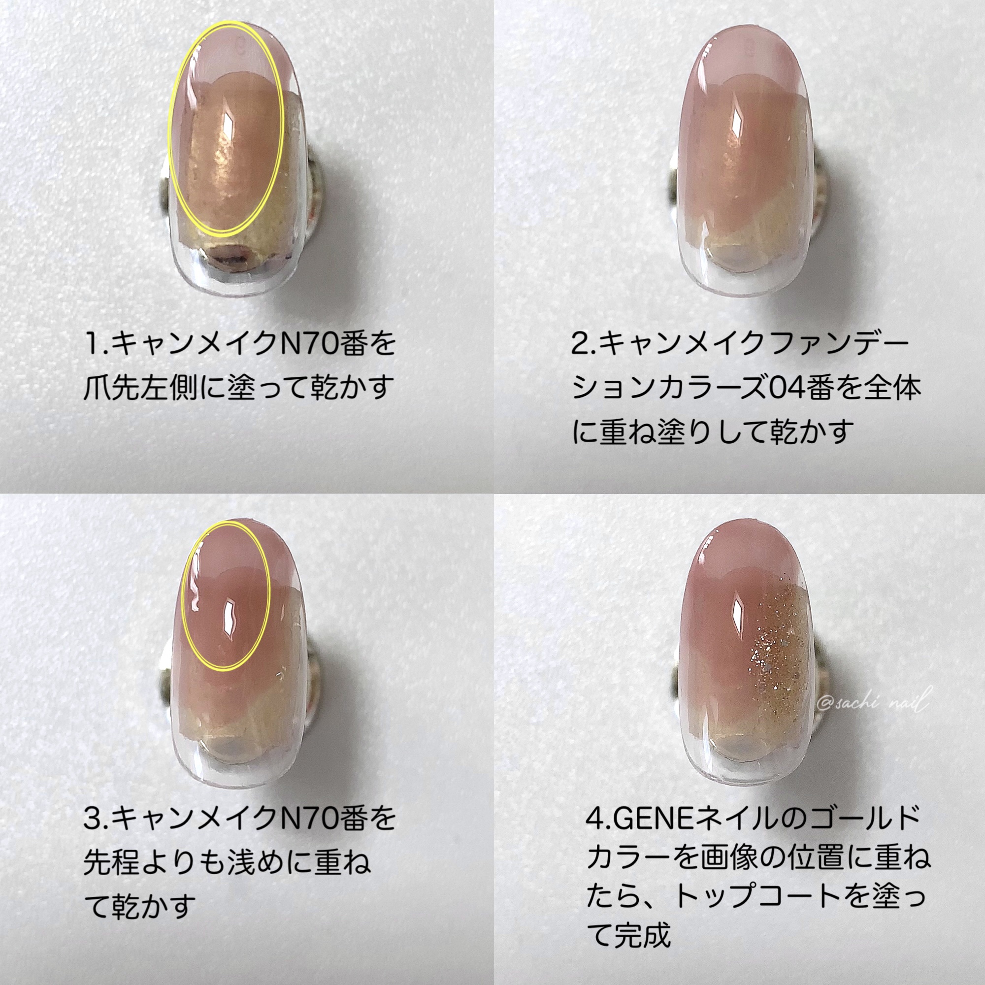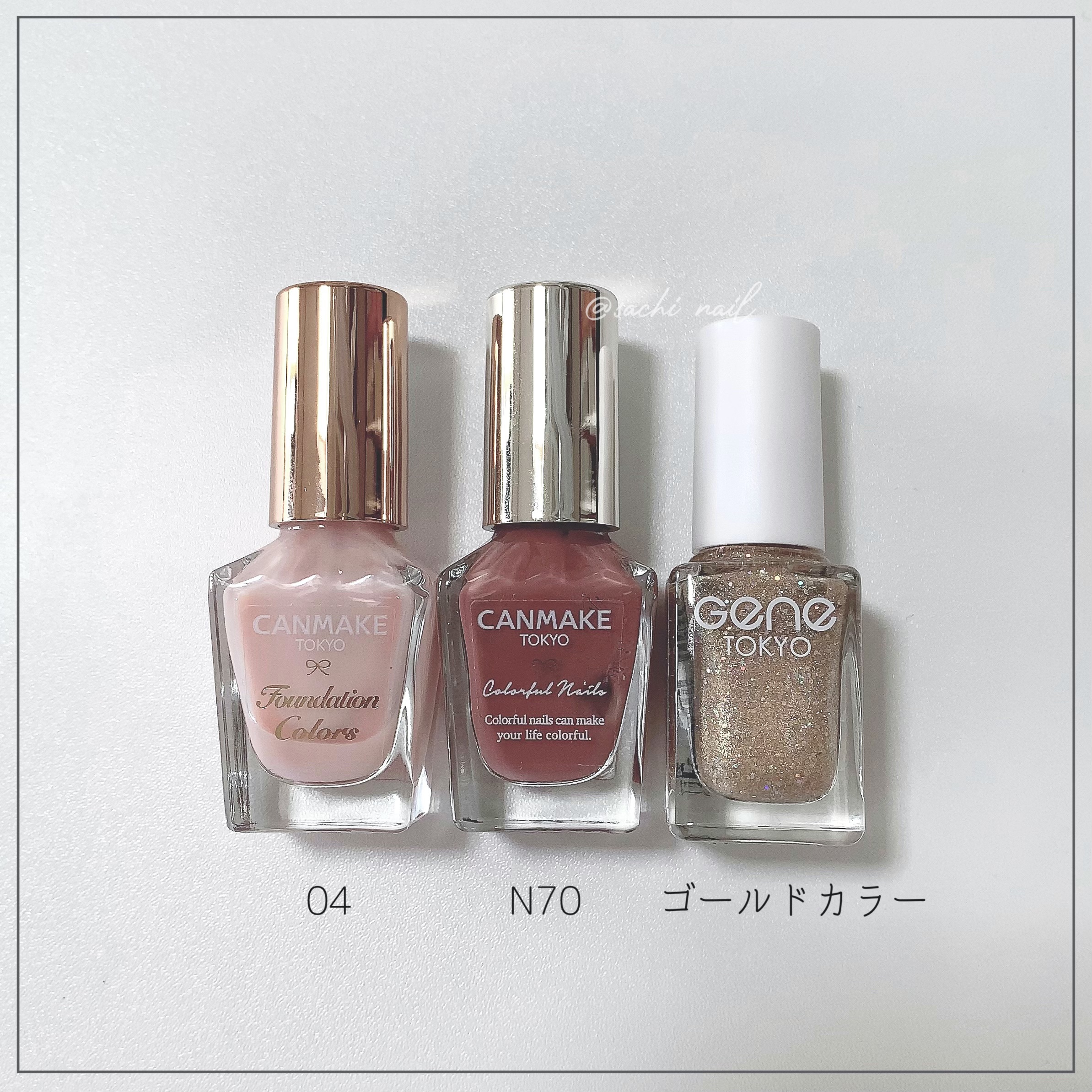中指をN17にすればオフィスにもいけそうなデザインで🤲🏻✨ 〚N17 クリームチャイ〛はキャンメイクおすすめの美ベージュです♡ キャンメイク カラフルネイルズ ¥396 〚N17 クリームチャイ〛 〚N29 ミルクシロップ〛 GENEネイル(ダイソー) ¥110 〚ゴールドカラー〛