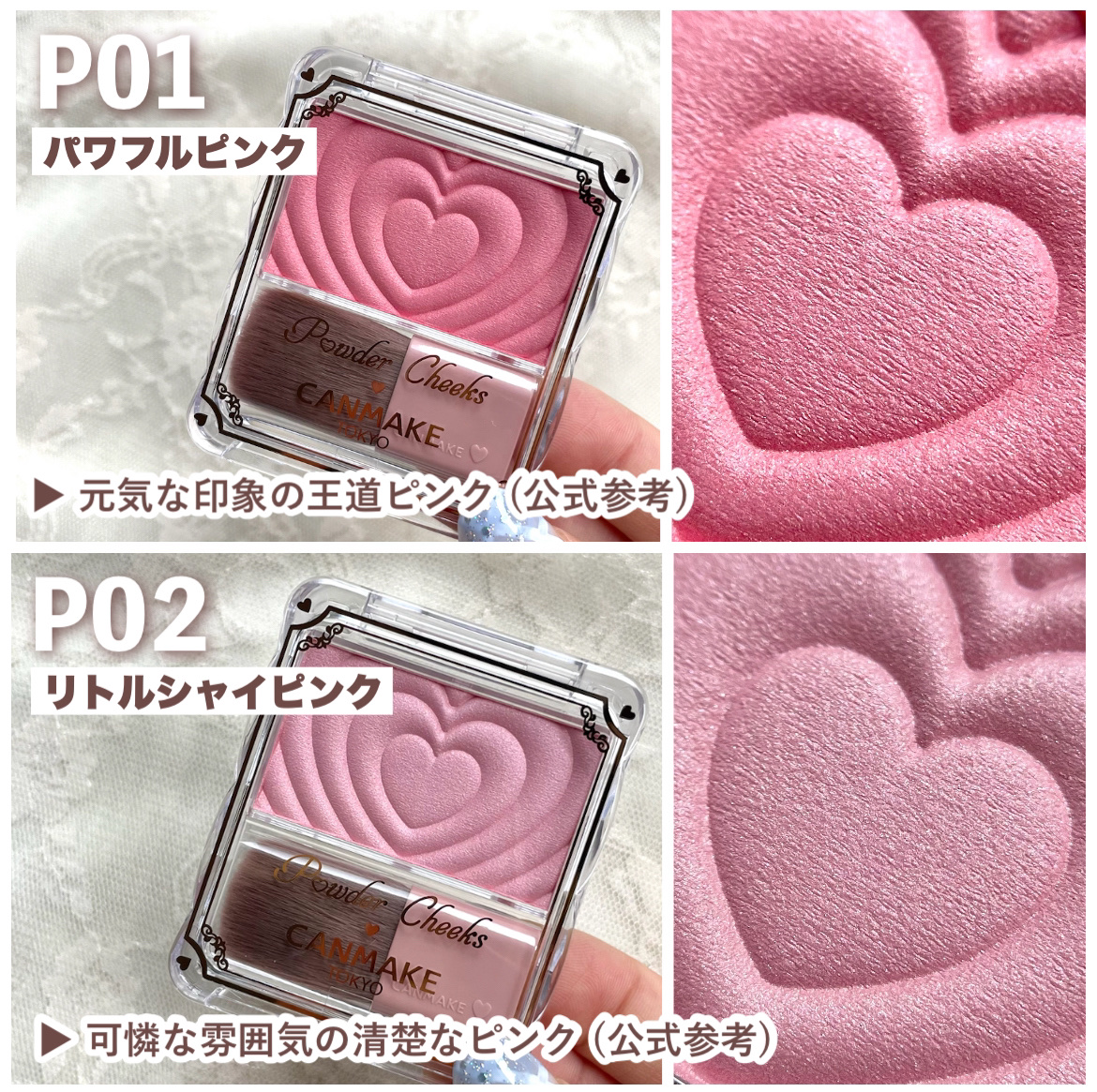 - <P01 パワフルピンク> タルク、リンゴ酸ジイソステアリル、合成フルオロフロゴパイト、トリエチルヘキサノイン、イソステアリン酸水添ヒマシ油、ポリグリセリル-3ポリジメチルシロキシエチルジメチコン、ラウリン酸亜鉛、メチルパラベン、酸化スズ、トコフェロール、オリーブ果実油、カニナバラ果実油、セラミドNP、シア脂、ホホバ種子油、マイカ、グンジョウ、酸化チタン、酸化鉄、赤202、赤226 <P02 リトルシャイピンク> タルク、リンゴ酸ジイソステアリル、トリエチルヘキサノイン、イソステアリン酸水添ヒマシ油、ポリグリセリル-3ポリジメチルシロキシエチルジメチコン、ラウリン酸亜鉛、メチルパラベン、トコフェロール、オリーブ果実油、カニナバラ果実油、セラミドNP、シア脂、ホホバ種子油、マイカ、グンジョウ、酸化チタン、水酸化Al、酸化鉄、赤226 <P03 チアフルピーチ> タルク、リンゴ酸ジイソステアリル、トリエチルヘキサノイン、イソステアリン酸水添ヒマシ油、ポリグリセリル-3ポリジメチルシロキシエチルジメチコン、ラウリン酸亜鉛、合成フルオロフロゴパイト、メチルパラベン、トコフェロール、オリーブ果実油、カニナバラ果実油、セラミドNP、シア脂、ホホバ種子油、酸化スズ、マイカ、酸化チタン、酸化鉄、赤226 <P04 クレバーベージュ> タルク、リンゴ酸ジイソステアリル、トリエチルヘキサノイン、イソステアリン酸水添ヒマシ油、ポリグリセリル-3ポリジメチルシロキシエチルジメチコン、ラウリン酸亜鉛、メチルパラベン、トコフェロール、オリーブ果実油、カニナバラ果実油、セラミドNP、シア脂、ホホバ種子油、マイカ、グンジョウ、酸化チタン、酸化鉄、赤226 <P05 クラッシーモーヴピンク> タルク、リンゴ酸ジイソステアリル、トリエチルヘキサノイン、イソステアリン酸水添ヒマシ油、ポリグリセリル-3ポリジメチルシロキシエチルジメチコン、ラウリン酸亜鉛、メチルパラベン、トコフェロール、オリーブ果実油、カニナバラ果実油、セラミドNP、シア脂、ホホバ種子油、マイカ、酸化鉄、酸化チタン、水酸化Al、グンジョウ、赤226 <P40thx キューティーベリー> タルク、リンゴ酸ジイソステアリル、トリエチルヘキサノイン、イソステアリン酸水添ヒマシ油、合成フルオロフロゴパイト、ポリグリセリル-3ポリジメチルシロキシエチルジメチコン、ラウリン酸亜鉛、メチルパラベン、トコフェロール、オリーブ果実油、カニナバラ果実油、セラミドNP、シア脂、ホホバ種子油、マイカ、酸化チタン、赤226、グンジョウ、酸化鉄、水酸化Al