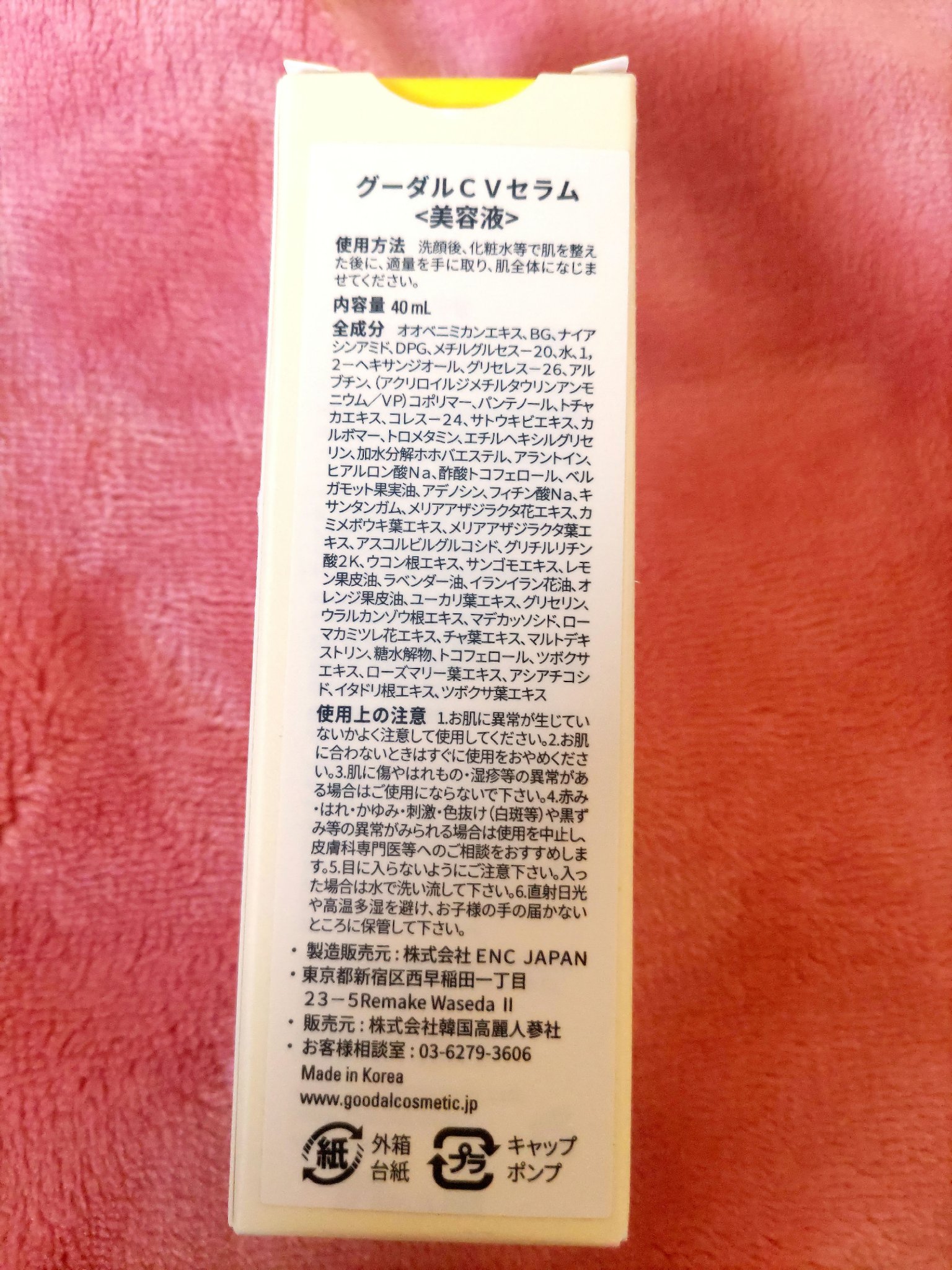 - ◆グーダル グリーンタンジェリンビタCダークスポットケアセラム 40ml 累積販売数:650万個*1 グーダルならではの厳格な基準*2を通過したこだわりの新鮮な済州無農薬青ミカンを直接収穫してAir Bubble Brewing工法で抽出 。生き生きとした印象の肌に。青みかんエキス(タンジェリンエキス)70%配合。乾燥によるくすみをケアし、透明感のある肌に導きます。 お肌のキメを整えるための整肌成分であるビタミンB3(ナイアシンアミド)が既存のグーダルグリーンタンジェリンビタCシミセラムプラスの2倍である4%になりました。 *1:2018.02~2023.09 全チャンネル販売数量基準|リニューアル製品を含む *2:7月中旬から8月中旬の間に獲れたての青ミカンの鮮度を現場ですぐに評価して選別し、超低温で管理、低い温度から直接抽出する青みかんエキス(整肌成分) <酸度>:㏗測定器、リトマス紙使用/酸度3.0~4.0かを確認 <果皮水分含量>:鮮度評価指標で皮の水分含量を測定