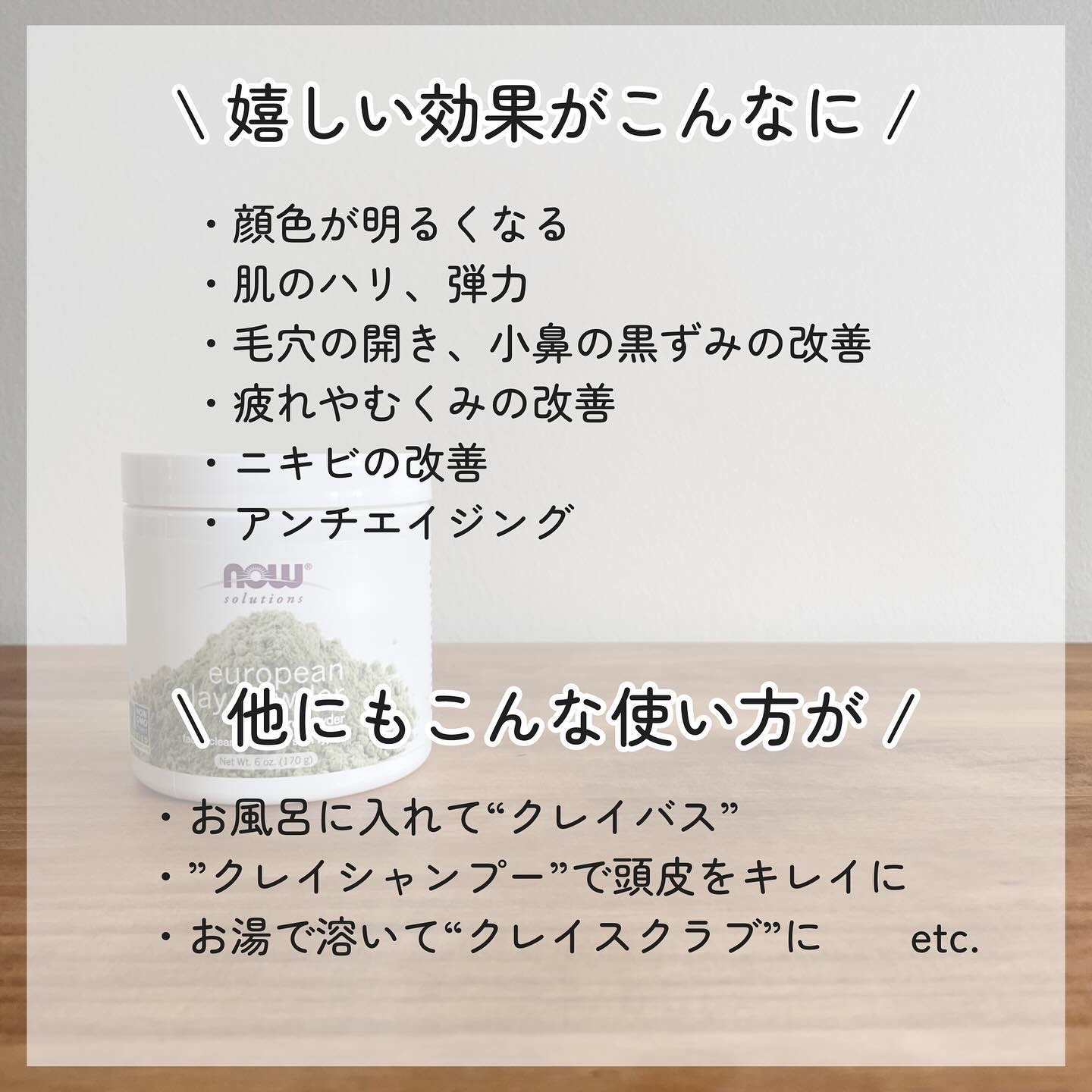 クレイって吸収・吸着効果があると言われていて、種類も豊富。肌質に合わせて選ぶと良いと言われてます。 ヨーロピアンクレイパウダーは天然ミネラルケイ酸金属塩で、水と混ぜると自然なスキントーニングクレイマスクに。 洗い流した後は余分なものが取り除かれてつるつるすべすべになるところが好きです^^
