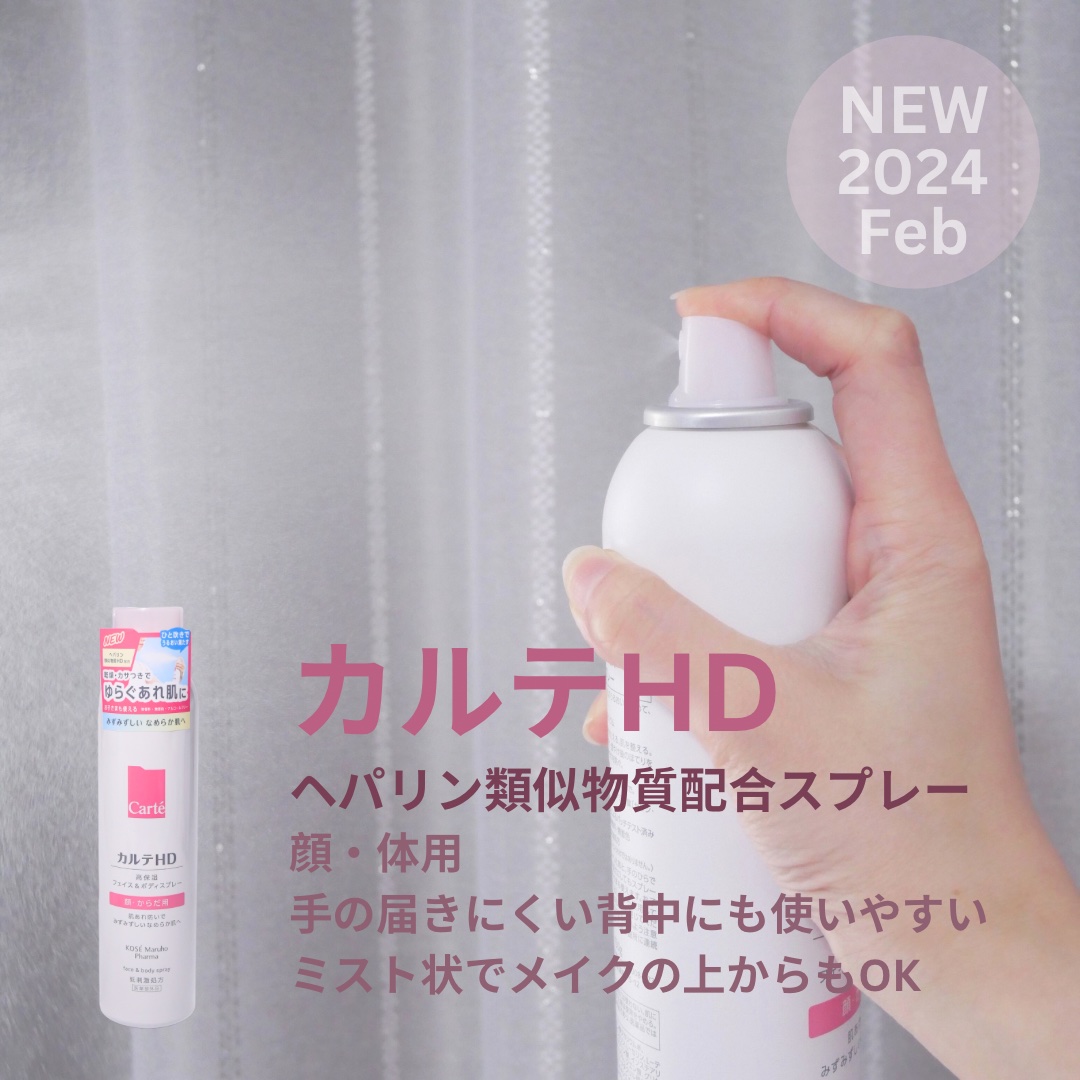 - 【全身用高保湿スプレー】 コーセーとマルホの合弁会社コーセーマルホファーマから発売された「カルテHD」。 エアゾールタイプの化粧水としては「初めて※1」ヘパリン類似物質HD※2を配合した全身用スプレー化粧水です。 配合のヘパリン類似物質HDはマルホから唯一供給を受けた「ヘパリン類似物質HD」を配合。 しっとり感とみずみずしさを叶える極上のミストが、すばやく広がり、全身をみずみずしいうるおいでふわっと包みます。 しっとりうるおうのにべたつかない軽やかな使い心地で、いつでもどこでも手軽な高保湿ケアを実現。 24時間乾燥の隙なし習慣を叶えます。 毎日のお顔のお手入れはもちろん、手の届きにくい背中などのボディケアや 子どもの全身保湿・男性のスキンケアなど幅広い場面で活躍。 うるおい構造(角層ラメラ)を整えて、あれにくい肌にみちびきます。 <販売名:HDフェイスボディSP> ※1 コーセーグループ商品として ※2 保水有効成分ヘパリン類似物質のこと