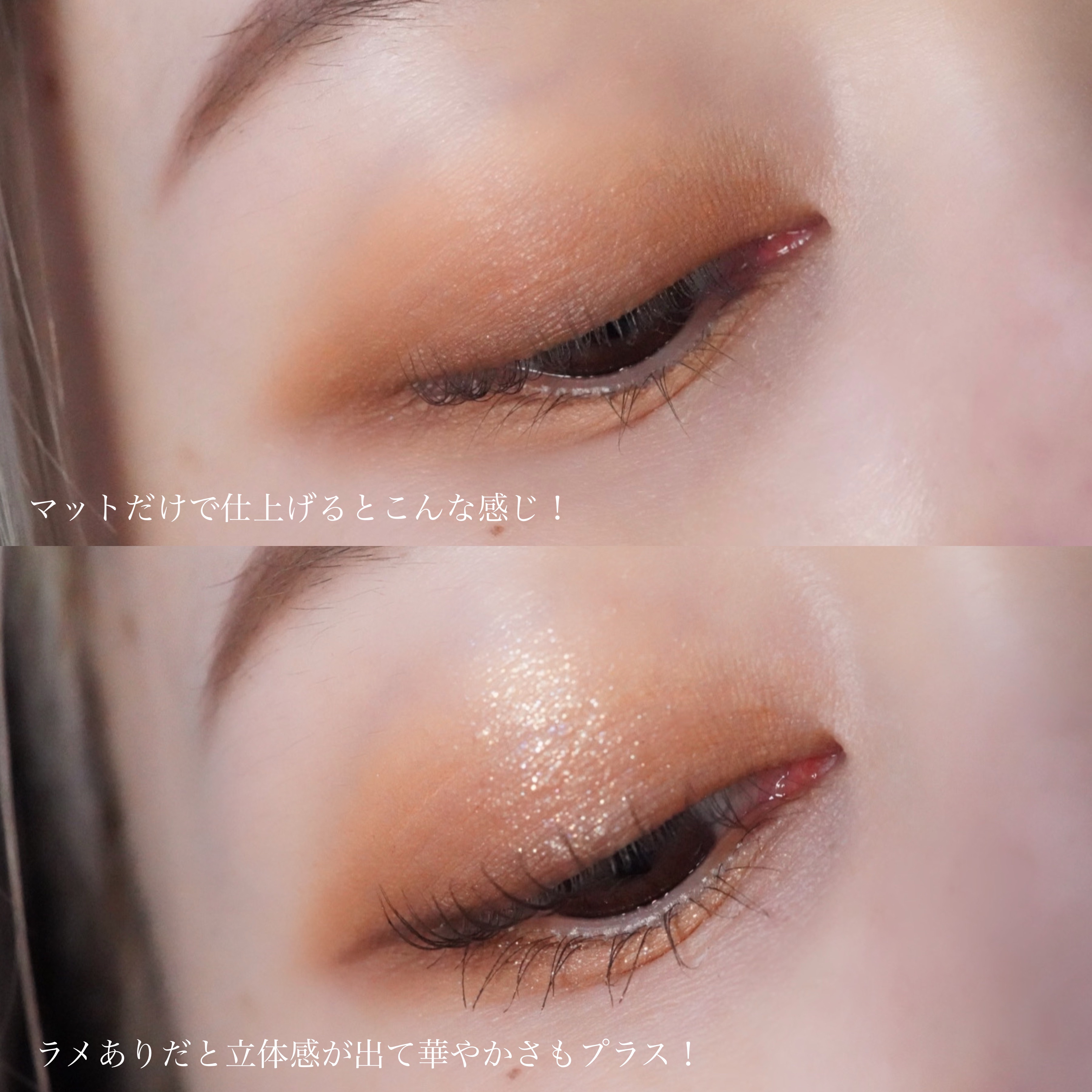 よくパレットのなかで明るいカラーをベースにまぶたに広く塗ることが多いのですが、パール感のあるカラーを避ける🙆♀️! パール感たっぷりの明るいカラーは涙袋に使うぐらい光を集めてぷっくり見せてくれるので、まぶたに広く使うと腫れぼったく見えがち😓 目元を明るくみせてくれたり、次に使うアイシャドウをぼかしやすくしてくれるけど、すっ飛ばしてメインのカラーを塗っちゃう✊🏻❤️🔥 涙袋にはたっぷり塗ってぷっくり見せる🙆♀️💕 シルキースフレアイズのマットタイプはすごく優れているな〜と感じました☺️💗 赤やオレンジなどは、入れすぎると腫れぼったく見えやすいので、見せたいカラーは下まぶた目尻にのせて色をたのしむ♡♡ パール感なしの透けマットだけじゃ物足りない… そう感じさせない華やかなラメが左上に入っているので黒目上と涙袋にのせるとすごく可愛い仕上がりに😍! 厄介な左右差のお陰でマットアイシャドウが好きになりました😌💕