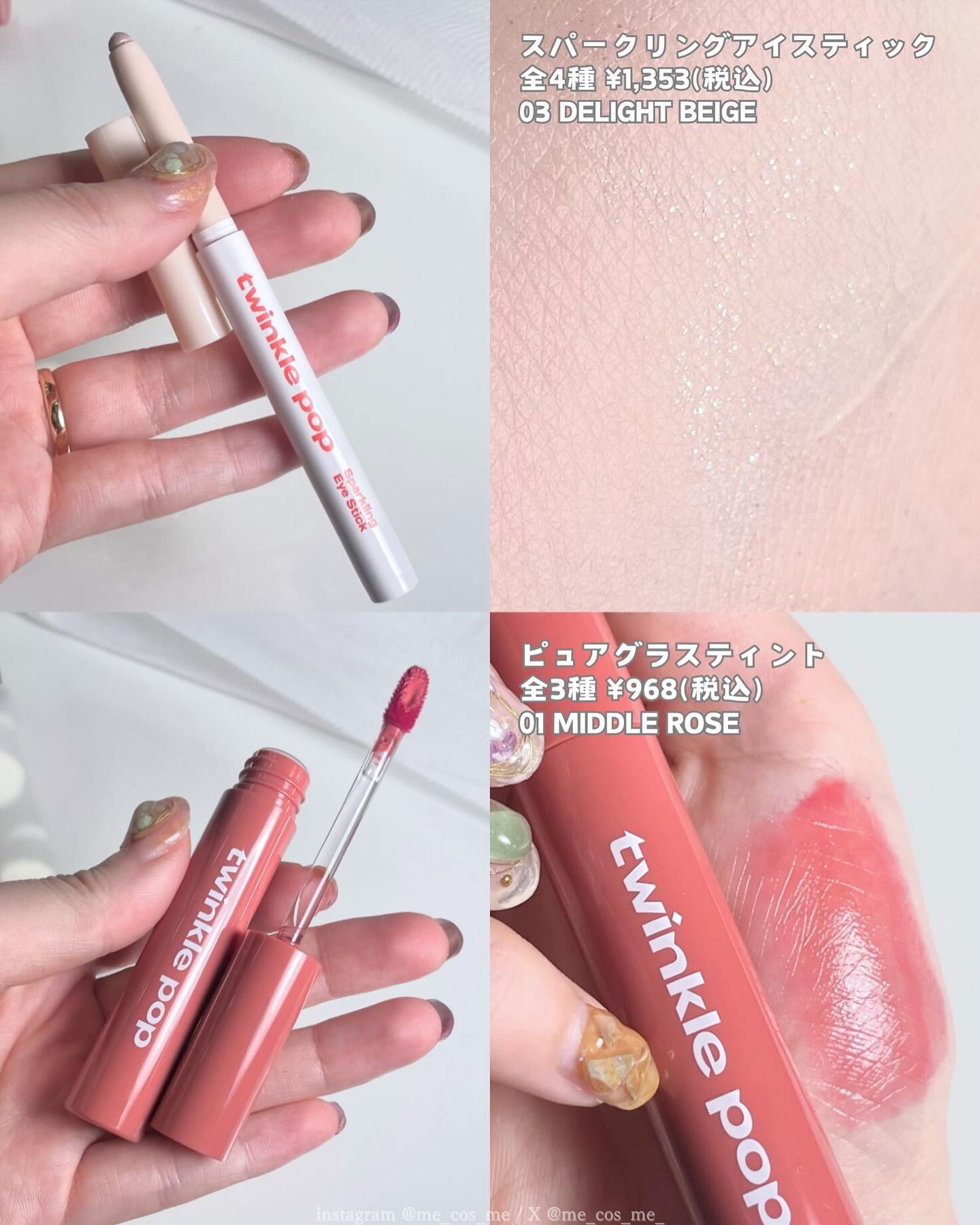 ジェリーグリッター 4SKU (税込¥858) ●01 Opal Banzzak ●04 Coral Banzzak ●05 Bronze Banzzak ●06 Cherry Blossom Banzzak グリッターアイパレット 4SKU (税込¥1,397) ●01 coral Layer ●02 Pink Layer ●03 Brown Layer ●04 Apricot Layer ピュアグラスティント 3SKU(税込¥968) ●01 Middle Rose ●02 Cool Mauve ●03 Warm Orange スパークリングアイスティック4SKU(税込¥1,353) ●01 Fine White ●02 Romantic Rose ●03 Delight Beige ●04 Merry Coral ジェルペンシルライナー 4SKU(税込¥880) ●01 Soft Black ●02 Deep Brown ●03 Choco Brown ●05 Under Beige スリムアイブロウ 3SKU(税込¥858) ●01 Gray Brown ●02 Dark Brown ●03 Natural Brown