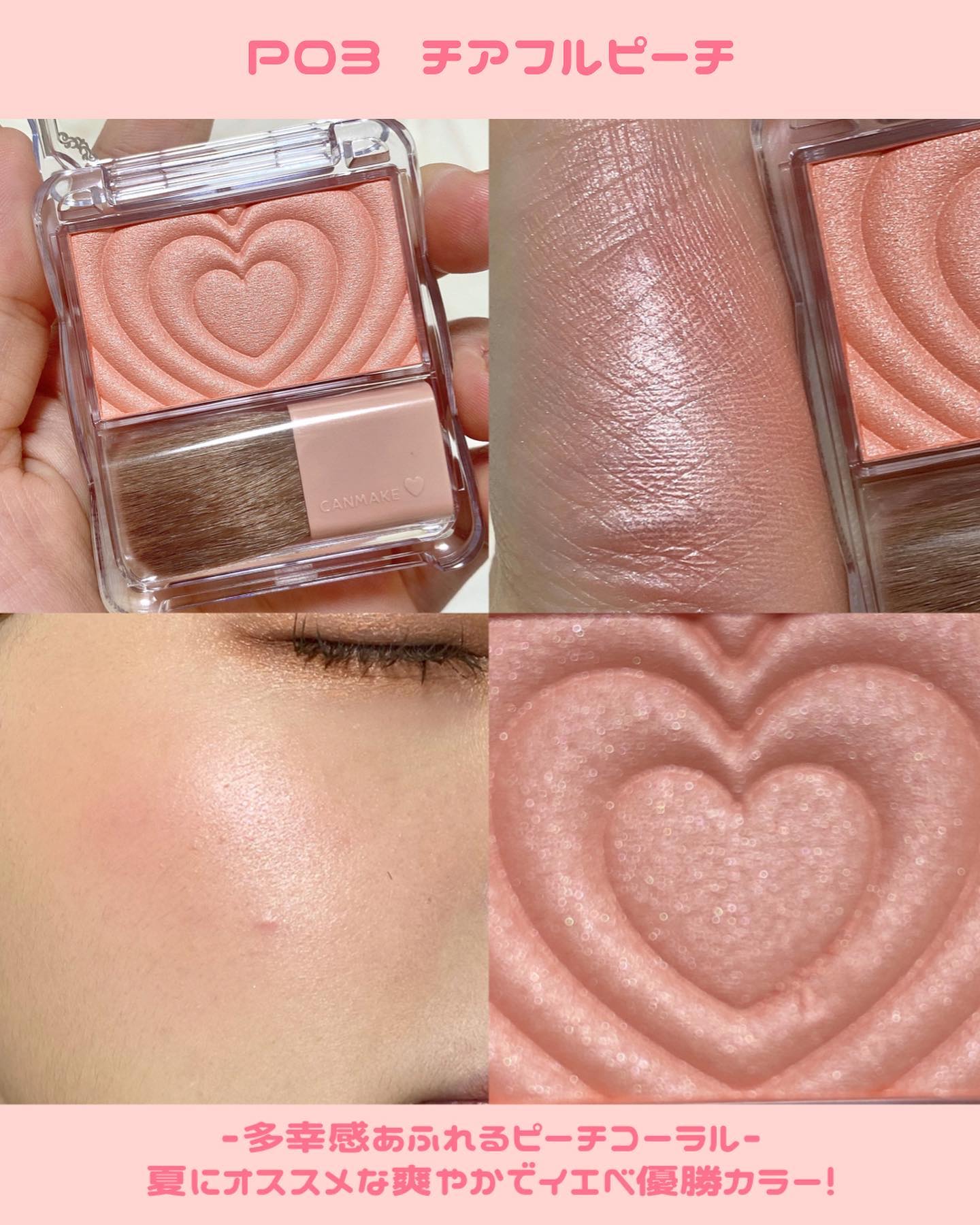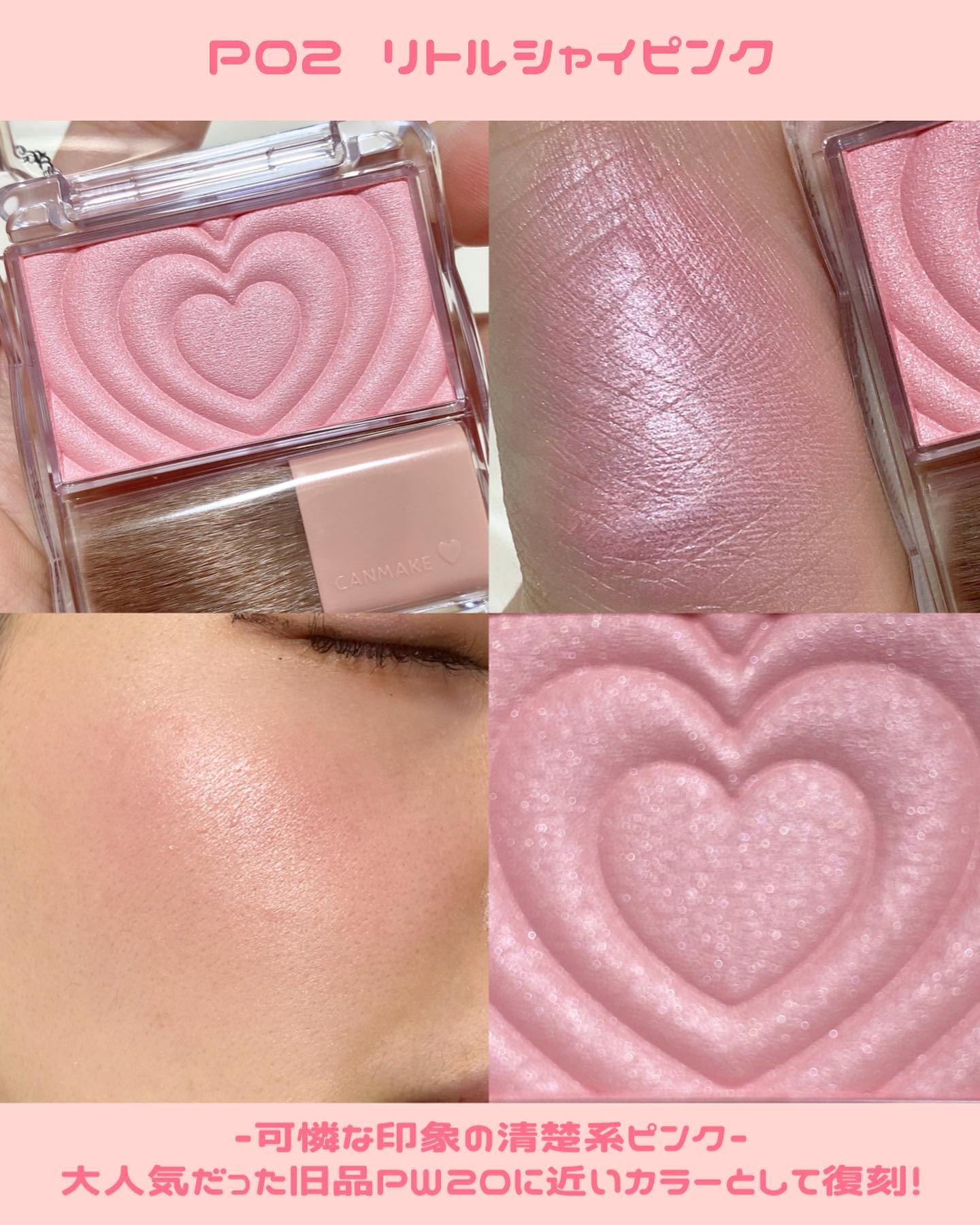 - 生まれ変わった、新・パウダーチークス! クリアな発色でしっとり溶け込むようなツヤ感単色チーク♡ 1.デザインがさらに可愛く♡ 使うたびにキュンとしちゃうハートデザイン♪ 2. 中身がもっと魅力的に ・しっとり感UP!※ ムラになりにくいクリアな発色 ・パール感がさらに繊細に!※ 溶け込むような自然なツヤ感です♪ 3. ブラシの毛量UP※ 広範囲に広げやすいふんわりブラシに進化! ※当社従来品比