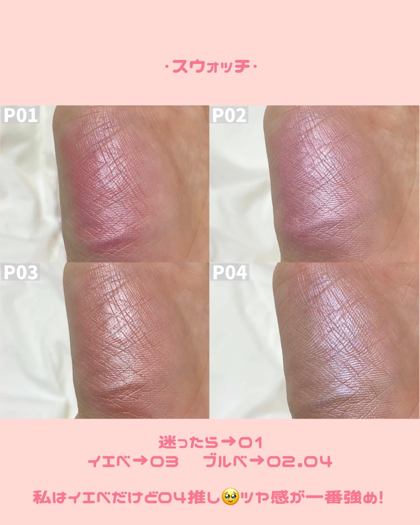- <P01 パワフルピンク> タルク、リンゴ酸ジイソステアリル、合成フルオロフロゴパイト、トリエチルヘキサノイン、イソステアリン酸水添ヒマシ油、ポリグリセリル-3ポリジメチルシロキシエチルジメチコン、ラウリン酸亜鉛、メチルパラベン、酸化スズ、トコフェロール、オリーブ果実油、カニナバラ果実油、セラミドNP、シア脂、ホホバ種子油、マイカ、グンジョウ、酸化チタン、酸化鉄、赤202、赤226 <P02 リトルシャイピンク> タルク、リンゴ酸ジイソステアリル、トリエチルヘキサノイン、イソステアリン酸水添ヒマシ油、ポリグリセリル-3ポリジメチルシロキシエチルジメチコン、ラウリン酸亜鉛、メチルパラベン、トコフェロール、オリーブ果実油、カニナバラ果実油、セラミドNP、シア脂、ホホバ種子油、マイカ、グンジョウ、酸化チタン、水酸化Al、酸化鉄、赤226 <P03 チアフルピーチ> タルク、リンゴ酸ジイソステアリル、トリエチルヘキサノイン、イソステアリン酸水添ヒマシ油、ポリグリセリル-3ポリジメチルシロキシエチルジメチコン、ラウリン酸亜鉛、合成フルオロフロゴパイト、メチルパラベン、トコフェロール、オリーブ果実油、カニナバラ果実油、セラミドNP、シア脂、ホホバ種子油、酸化スズ、マイカ、酸化チタン、酸化鉄、赤226 <P04 クレバーベージュ> タルク、リンゴ酸ジイソステアリル、トリエチルヘキサノイン、イソステアリン酸水添ヒマシ油、ポリグリセリル-3ポリジメチルシロキシエチルジメチコン、ラウリン酸亜鉛、メチルパラベン、トコフェロール、オリーブ果実油、カニナバラ果実油、セラミドNP、シア脂、ホホバ種子油、マイカ、グンジョウ、酸化チタン、酸化鉄、赤226 <P05 クラッシーモーヴピンク> タルク、リンゴ酸ジイソステアリル、トリエチルヘキサノイン、イソステアリン酸水添ヒマシ油、ポリグリセリル-3ポリジメチルシロキシエチルジメチコン、ラウリン酸亜鉛、メチルパラベン、トコフェロール、オリーブ果実油、カニナバラ果実油、セラミドNP、シア脂、ホホバ種子油、マイカ、酸化鉄、酸化チタン、水酸化Al、グンジョウ、赤226 <P40thx キューティーベリー> タルク、リンゴ酸ジイソステアリル、トリエチルヘキサノイン、イソステアリン酸水添ヒマシ油、合成フルオロフロゴパイト、ポリグリセリル-3ポリジメチルシロキシエチルジメチコン、ラウリン酸亜鉛、メチルパラベン、トコフェロール、オリーブ果実油、カニナバラ果実油、セラミドNP、シア脂、ホホバ種子油、マイカ、酸化チタン、赤226、グンジョウ、酸化鉄、水酸化Al