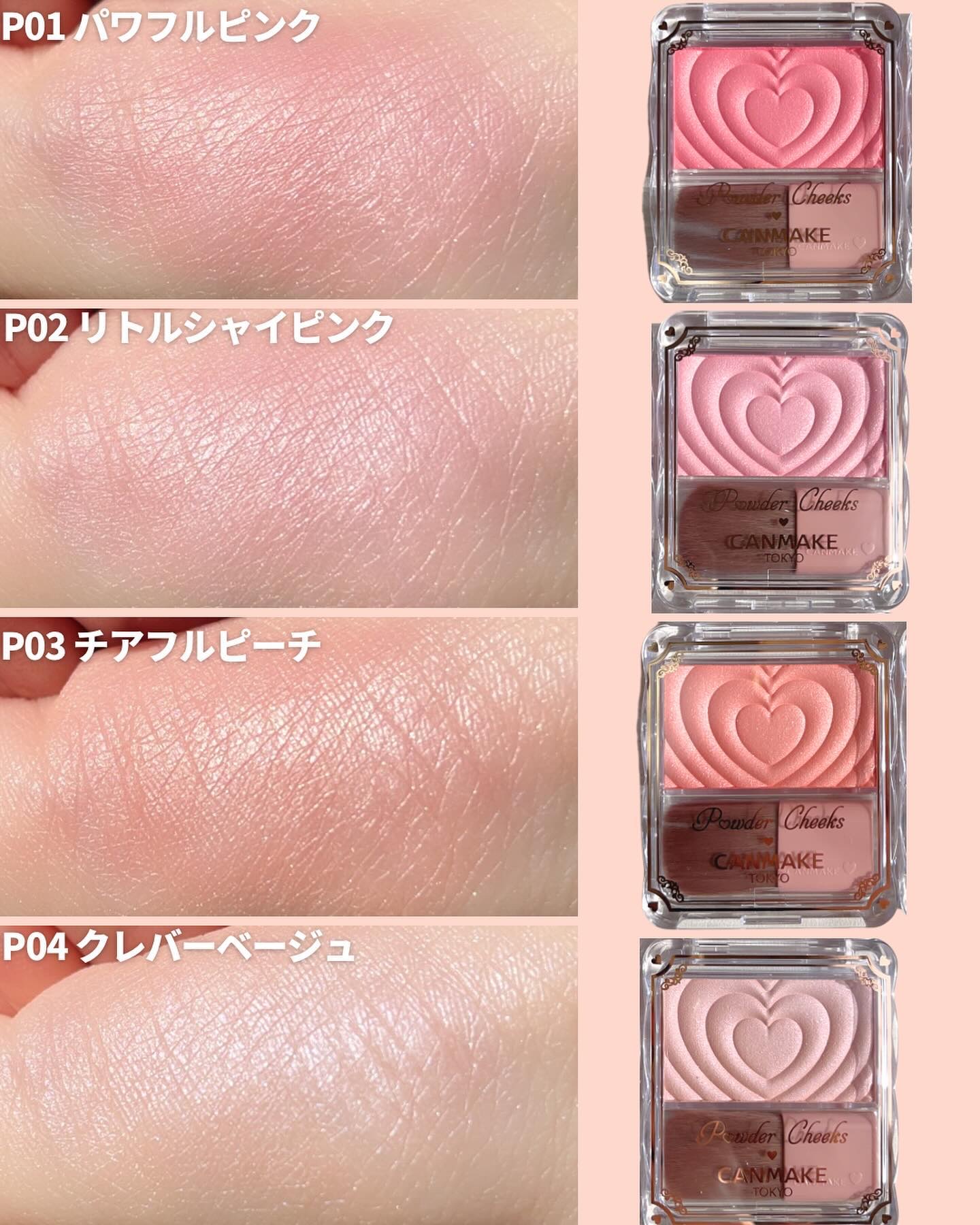 - 生まれ変わった、新・パウダーチークス! クリアな発色でしっとり溶け込むようなツヤ感単色チーク♡ 1.デザインがさらに可愛く♡ 使うたびにキュンとしちゃうハートデザイン♪ 2. 中身がもっと魅力的に ・しっとり感UP!※ ムラになりにくいクリアな発色 ・パール感がさらに繊細に!※ 溶け込むような自然なツヤ感です♪ 3. ブラシの毛量UP※ 広範囲に広げやすいふんわりブラシに進化! ※当社従来品比
