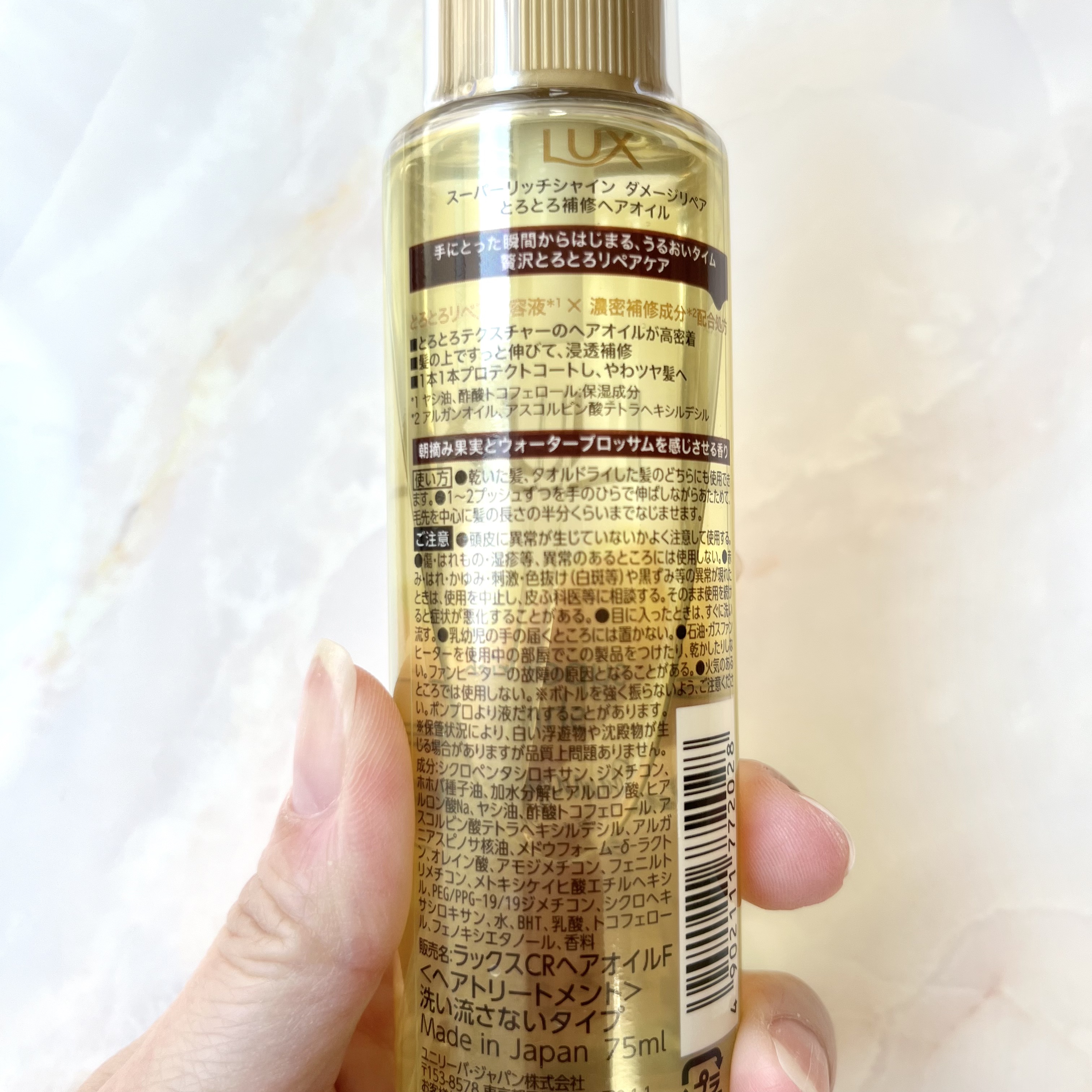 贅沢にとろとろリペアケアできるヘアオイル。 程よくとろみがあり使いやすい! お風呂上がり後のタオルドライした髪に使用することが多いのですが、素早く髪に馴染ませることができます。 ドラッグストアでお手頃価格で買うことができてこのクオリティはすごい!!