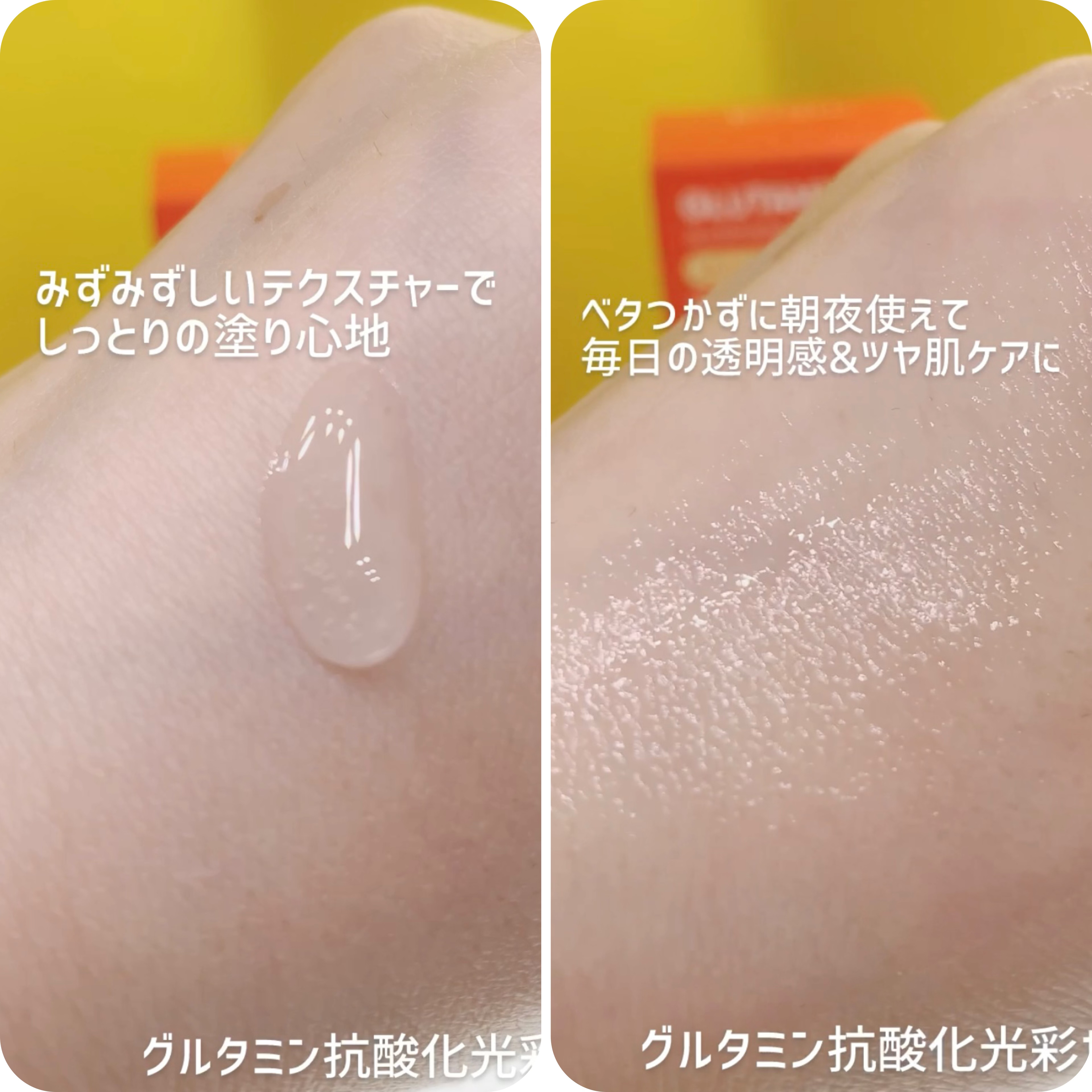 - グルタチオンとビタミン5種を整肌成分として配合、潤いとツヤを与え肌の角質層から弾力ケアして透明感のある肌へと導き、乾燥くすみもケア