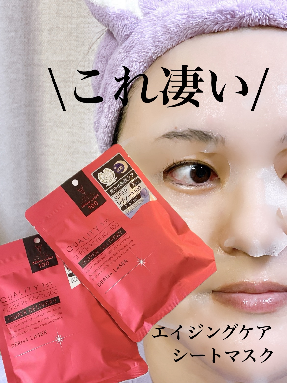ダーマレーザー スーパーレチノール100マスクはドラッグストアやスーパー・バラエティショップなどで購入できるよ。やや薄めのシートであまり伸縮性はないけどやわらかくフィット感あり!エッセンスもヒタヒタに浸かってる。 ダーマレーザー EX スーパーレチノール+ハイドロキノン マスクはイオン限定だよ!肉厚のふっくらやわらかシートでエッセンスがたっぷり!しっかりうるおうのに、なじみも良くベタつかないよ! 私のお気に入りはイオン限定の方かな。
