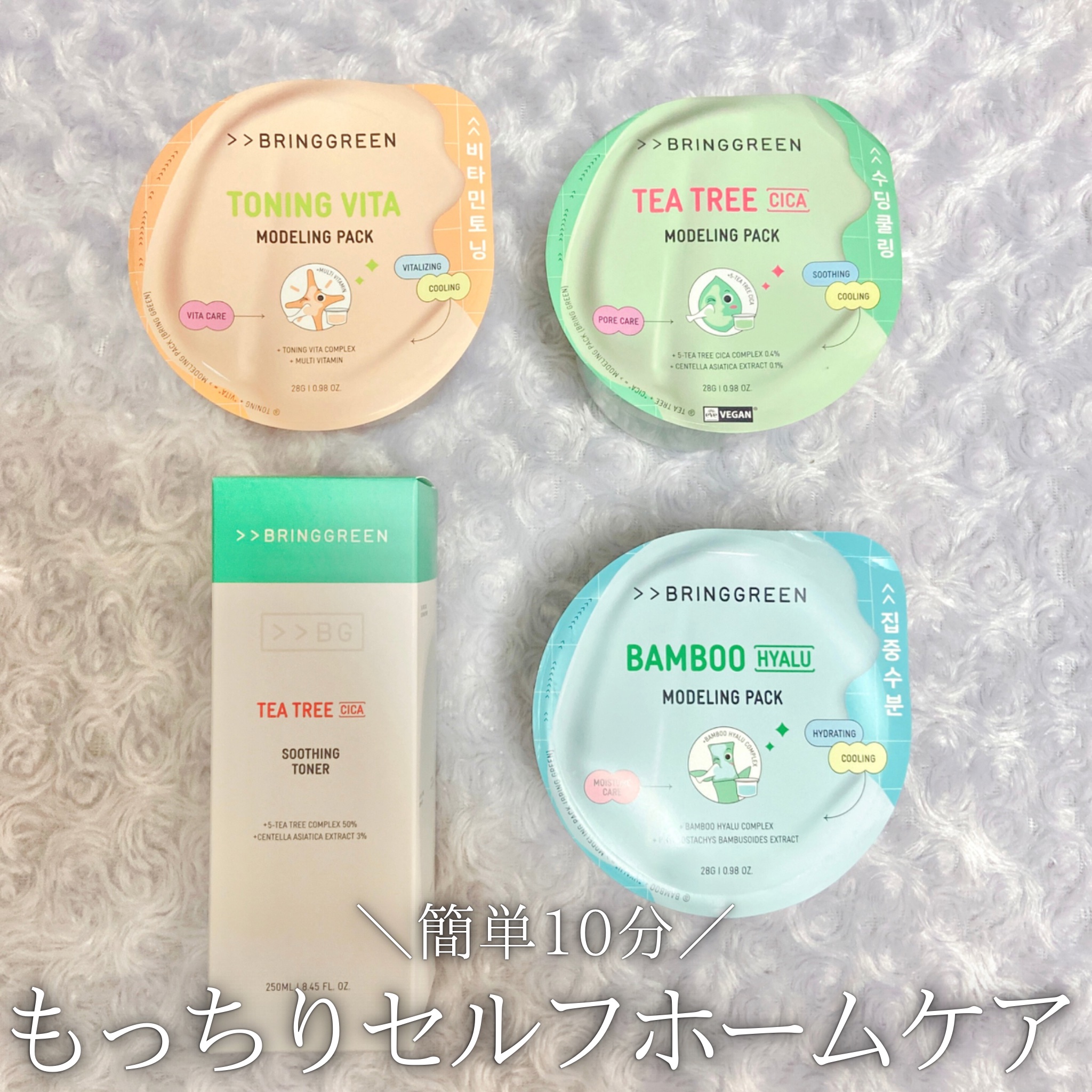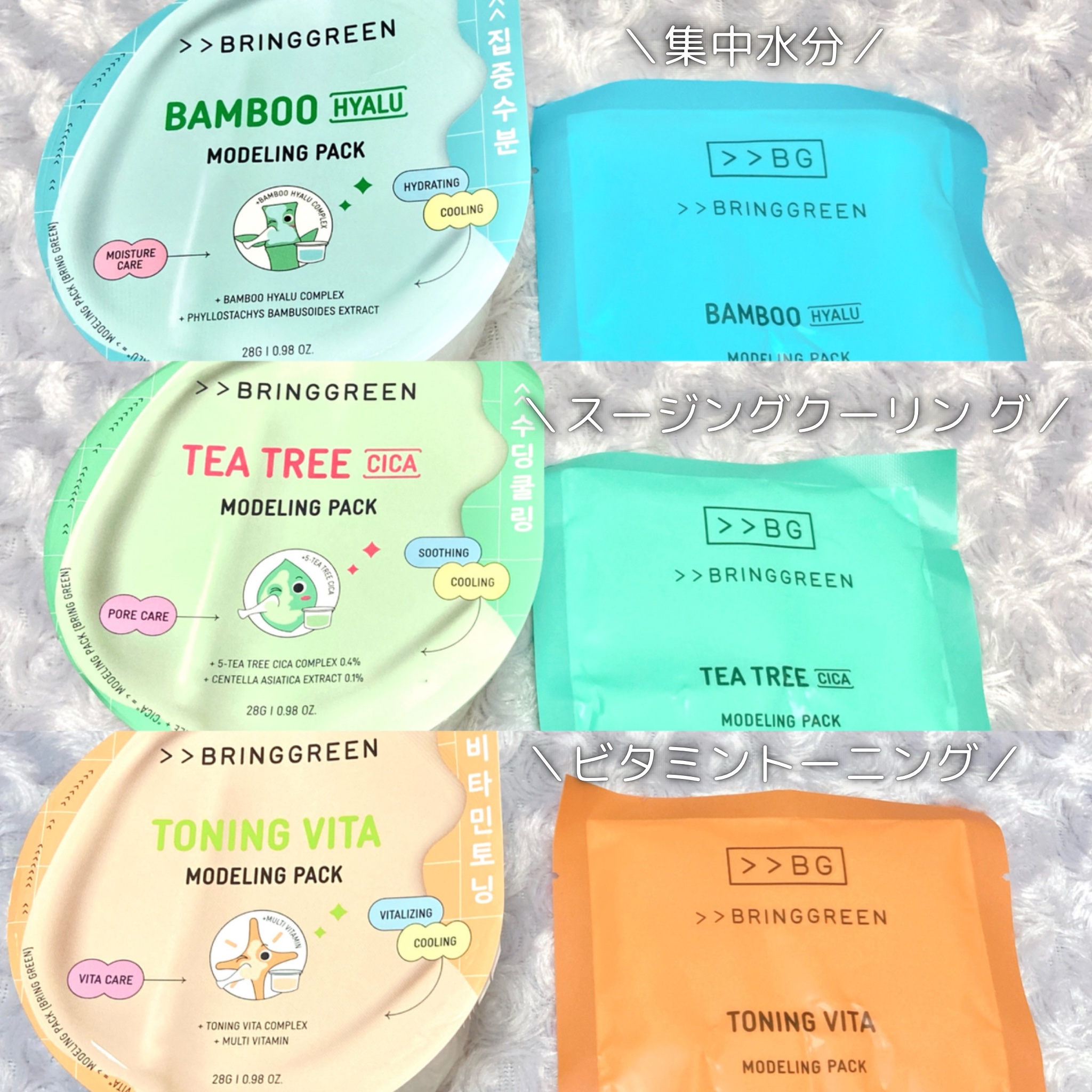 BRINGGREEN様のイベントでBRINGGREENMODELINGPACKが当選しましたのでレビューします。リニューアル後の新バージョンです。・ティーツリーシカ〈水分鎮静〉・バンブーヒアル〈水分チャージ〉・スーパーレモングルタチオン〈水分...