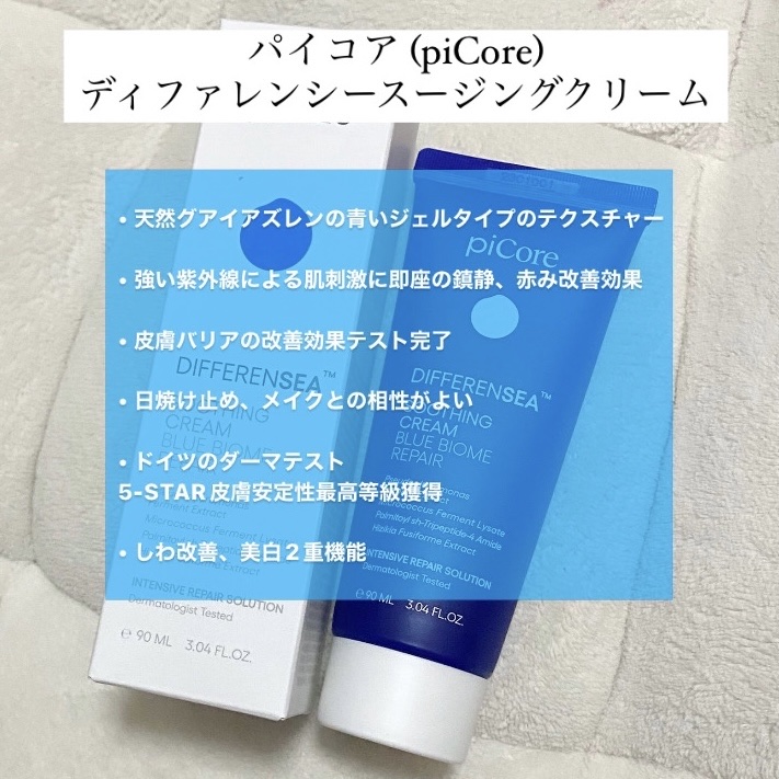 パイコア(piCore)ディファレンシースージングクリーム天然グアイアズレンという色素を使ったスージングクリームスリーピングマスクに使っていますなめらかなジェルお色がすごくきれい!軽めのさっぱりとした使い心地追い保湿でしっかり冬もケアしたいな...