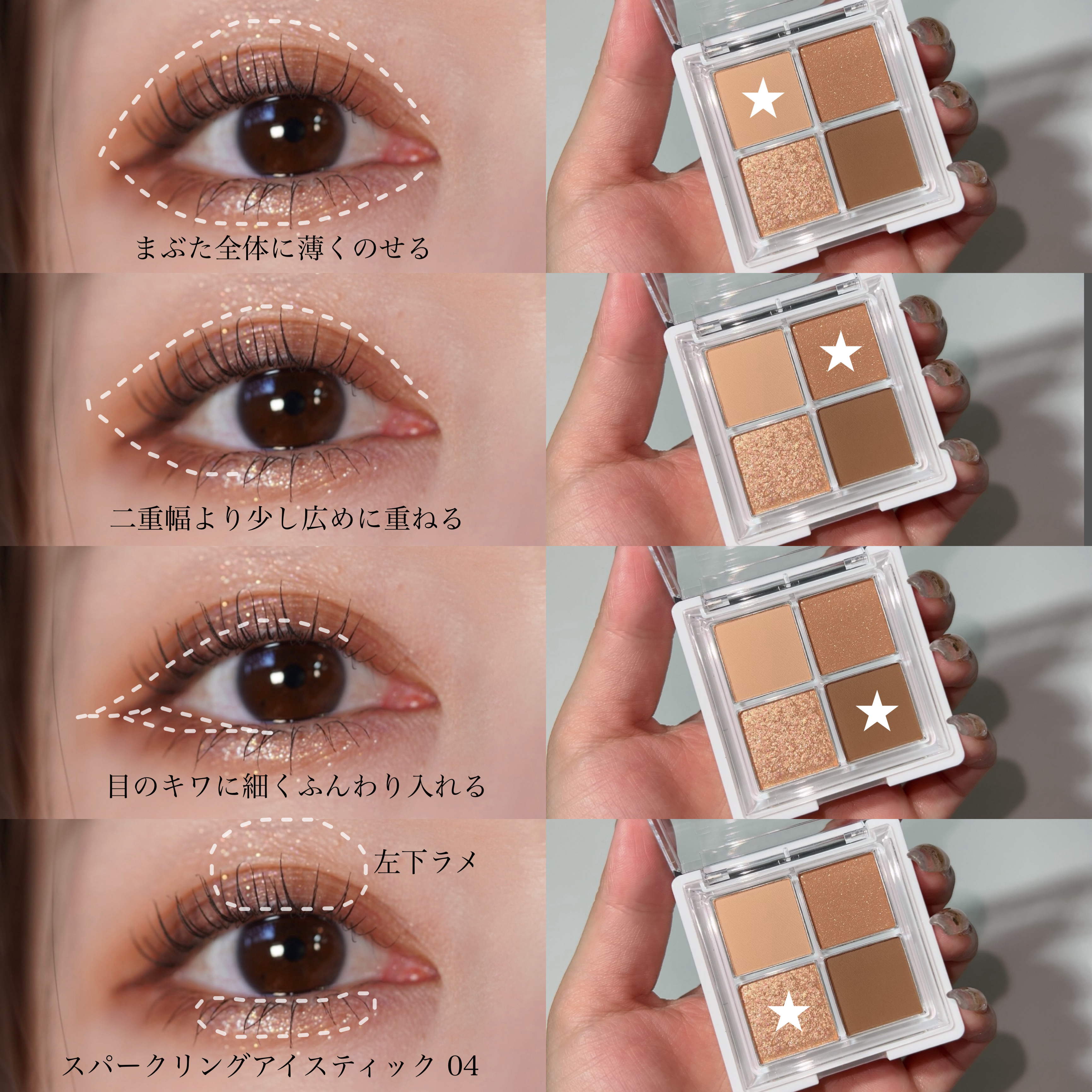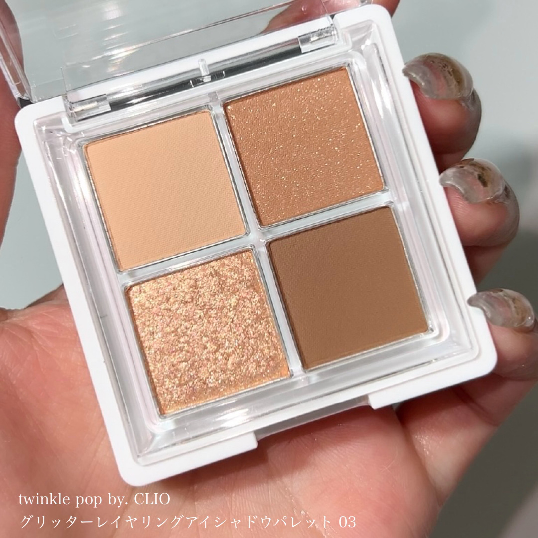 目元にやさしくのせるグリッターレイヤーリング マットからグリッターまで多彩で、デイリーメイクから特別な日のメイクまで 1本でマルチなアイメイクができる ぷっくり涙袋や、ぼかしてアイシャドウにも オレンジコーラルはけっこう発色が濃いめなので、私は少量をぼかして他のベージュカラーと混ぜて使いました。