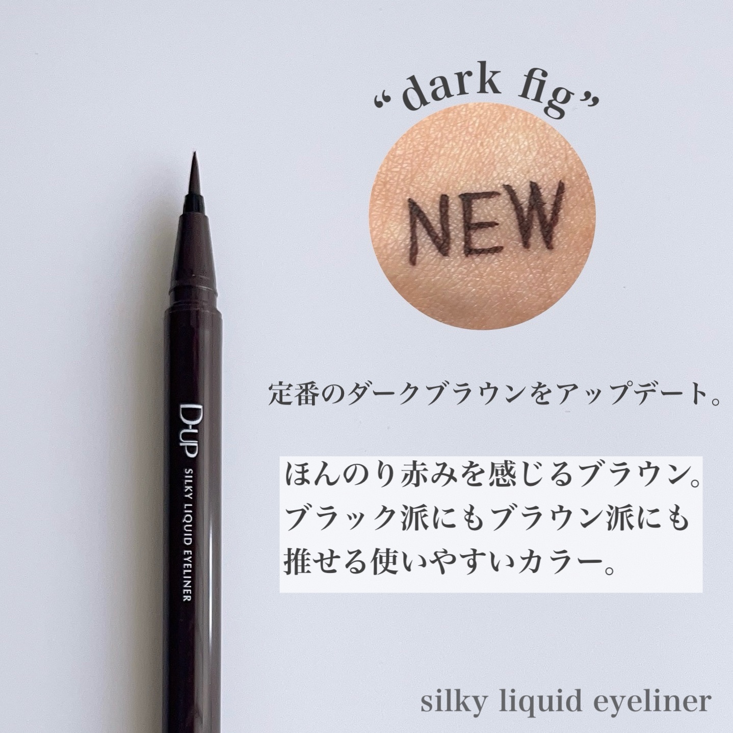 - 筆先までずっとなめらか、目尻で感動するリキッドアイライナー。 必要な量が肌にのる新設計で、まぶたの上をすべるような、滑らかな描き心地。しなやかでコシのある筆が、筆圧のコントロールを容易にし、太いラインも細いラインも思い通りに仕上げます。水、汗、涙に強いウォータープルーフタイプなのに、通常洗顔で簡単オフ。肌に色素が残らない顔料を使用。5種類の美容液成分を従来品の200%配合し、メイクしながら目元ケアまで。 ●ブラウンブラック ※2020年9月12日 バラエティショップ先行発売 ●漆黒ブラック ※2020年12月頃発売予定 ●ナチュラルブラウン ※2020年12月頃発売予定 ●シフォンブラウン 「毎日メイクに透明感と抜け感」 ブラウンでも、グレーでも、ベージュでもないニュアンスカラー。 自然な印影で素の目元を際立て、頑張りすぎない、ふんわりとした目元に。 ●アプリコットブラウン 「じゅわっと血色感。 肌に馴染むおしゃれカラー」 温かみのあるアプリコットがじゅわっと滲む血色感を目元に演出。 肌馴染みが良いので、カラーライナーに抵抗がある方もブラウンの延長線上で楽しめる、使いやすい色味です。 ”ちょっとオシャレ”な空気感を演出するカラー。 ●ピンクショコラ アイライナー 「ピンクが溶け込む濃厚ブラウン」 肌馴染みが良く、目元にじんわり血色感をプラス。 さりげなく女性らしさが加速するようなカラー。 ●ピスタチオラテ (2022年7月29日(金)発売) 「“目尻”に抜け感アクセント」 肌に馴染むのに映える絶妙なグリーン。 トレンドカラーに“くすみ”と“抜け感”をプラスしたまろやかな発色。 ●マスタードブラウン 「“イエロー”が揺れる、大人の洒落色」 (2022年7月29日(金)発売) まるで太陽のような暖かさを感じる新しいブラウン。 ほんのり感じるイエローでメイクが一気に垢抜ける稀有な色。 ●シフォンピンク(2023年2月10日発売) 「ふんわり柔らか"まろみピンク"」 甘くなりすぎない青みニュアンスで目元の透明感UP。 目元を引き締め、ピンクメイクにありがちな腫れぼったさを解消。 ●ミルクカプチーノ(2023年4月21日発売) まろやかな深みの“優しい締め色” どんなメイクにも合わせやすいカラー。 自然な陰影でさりげなく目幅を拡張します。 ●グレーカシミア(2023年10月1日発売) ブラウンがほんのり溶け込んだ、暖色グレー まろやかな発色で、パーソナルカラーを問わず肌に馴染む 目元の陰影になりすまし、抜け感と目力を欲張りに叶える ●ダークフィグ(2024年6月1日発売) するする”なめらか。描きやすいのに、落ちにくい。 クッキリ可愛いほの甘ダークブラウン ●ピーチモカ(2024年8月1日発売) ふわっと自然に盛れる“桃色ブラウン” ほんのり血色感で目元にうるみ感を演出 ●スターダストブラウン(2024年12月11日発売) キラッと繊細に輝く''星屑ブラウン'' 透け感のあるダークブラウンの色味とラメの輝きが、目元に艶のある立体感を演出 ●チャコールモカ(2025年4月10日発売) 目元を締める''深みグレージュ'' 黄みや赤みに偏りすぎない絶妙な色設計で、自然に目元を強調
