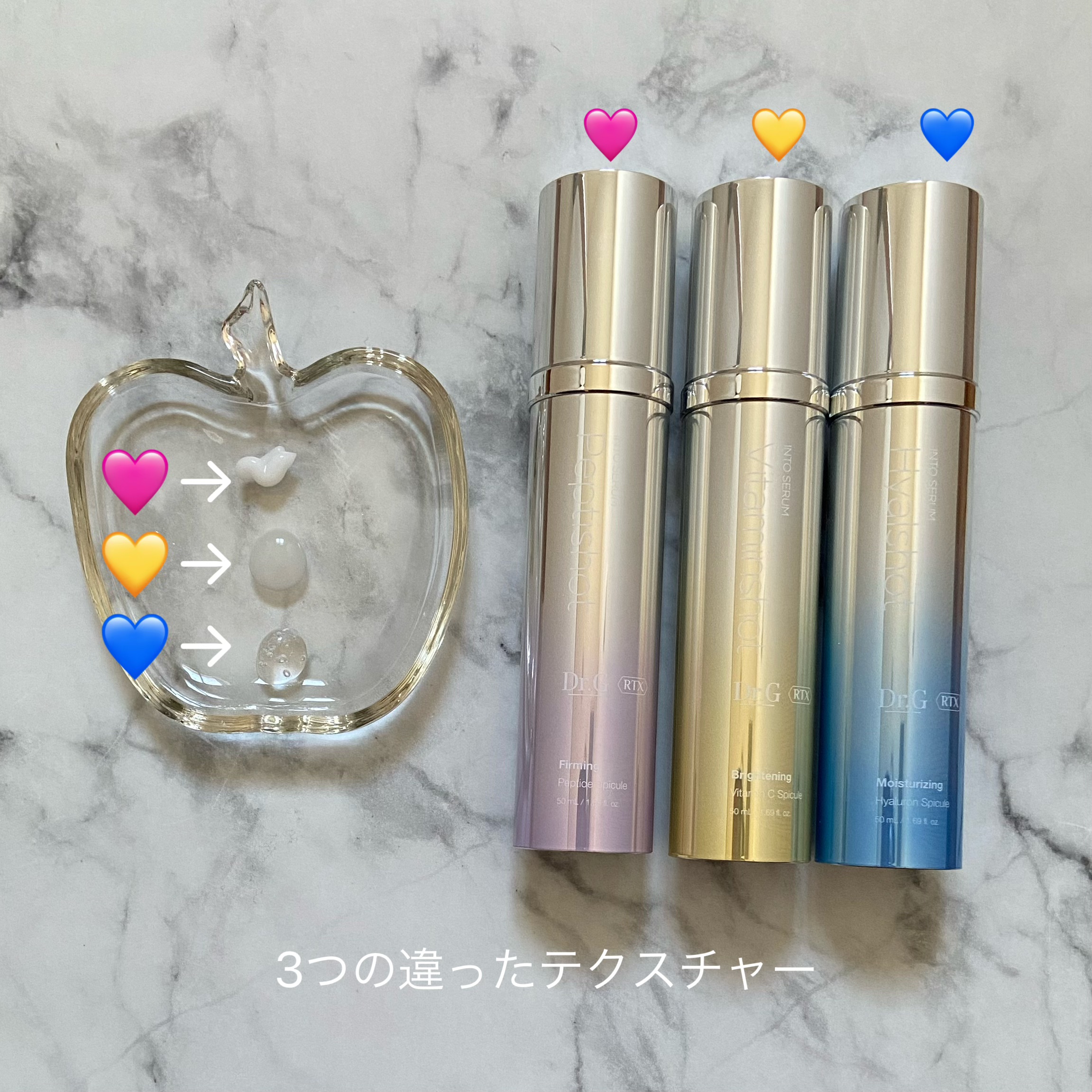 - RTXラインは、10年ぶりに復活した、専門家のノウハウを凝縮させたラインです。 近年、”美容施術”や”美容皮膚科”への関心が高まり、併せて、”セルフでも高いレベルのケア”を求める方や成分について興味を持つ方も増加傾向にあります。 そこで開発されたのがRTXセラムです。 RTXセラムは、美容保湿成分の入ったスピキュール*とエクソソーム*を使ったこだわりの美容液です。 スピキュール*が90万個も入っています。 Dr.Gのスピキュールは、スピキュールそのものに美容保湿成分が入っている第3世代スピキュールです。 肌(角質層)に浸透したあとに、コーティングされた美容液が弾けて一気に満たします。さらに、毛穴より2600倍も小さい美容保湿成分を含んだエクソソーム*で隅々まで浸透させます。 Dr.Gのスピキュール*は中が空洞になっている、ストローのような形をしている、純度100%のエアロショットです。 3種類の美容液があり、それぞれ、ツヤケア効果、水分ケア効果、ハリ弾力ケアをもたらします。 水光肌の演出 ヒアルロン酸スピキュール*で肌の角質層から潤わし、AHA エクソソーム*で目に見える肌のキメケア *整肌成分