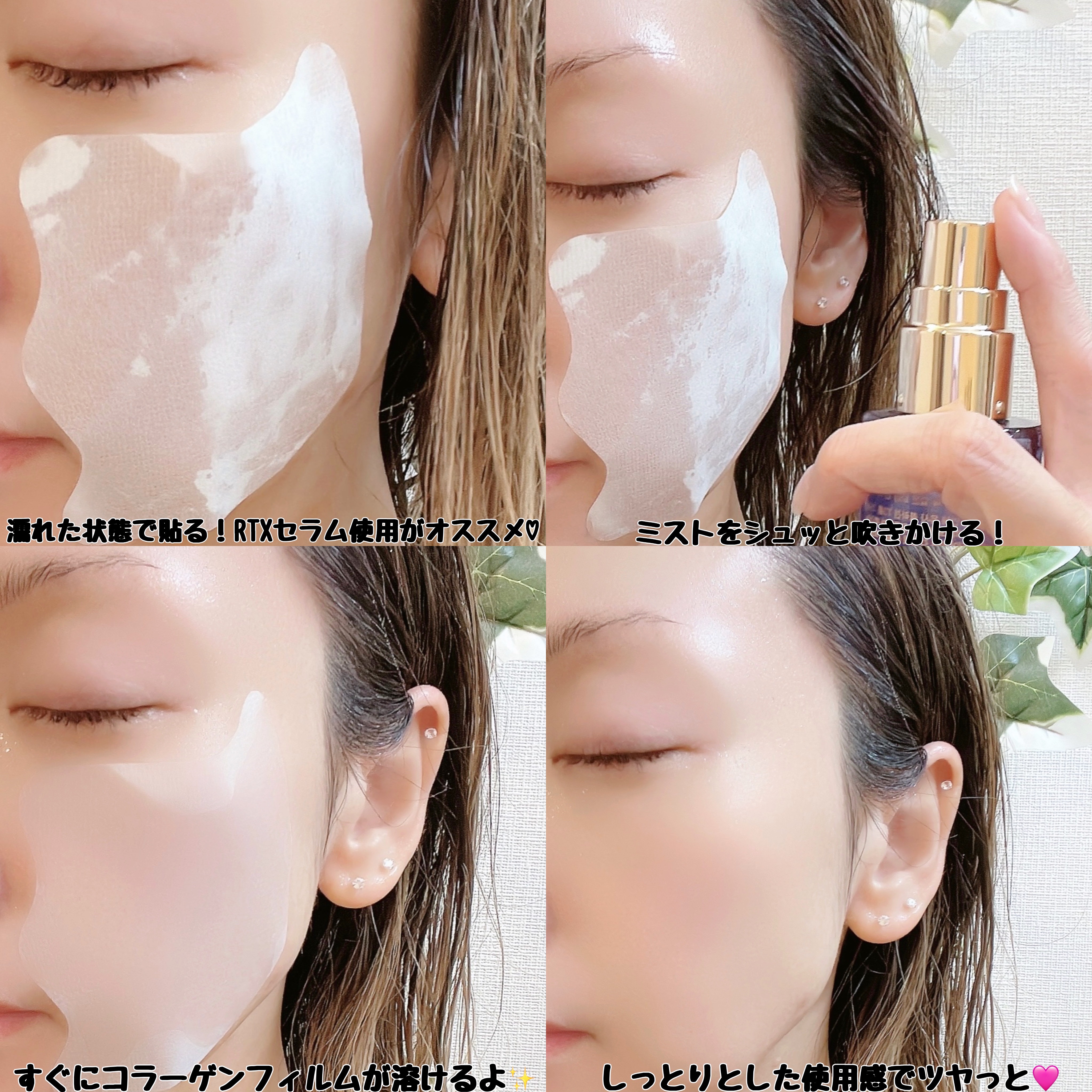 RTXイントゥメルティングコラーゲンフィルムは直接お肌に貼ることでコラーゲンが溶け込むの♡ 洗顔後の保湿したお肌にシートを乗せて、セラムミストを吹きかけるとスーっと溶け込んでいくのが新感覚♪ ブラックスネイルコラーゲントゥーミストセラムはとろっとしたセラムなんだけどシュッとするとミストで出てくるから不思議✨