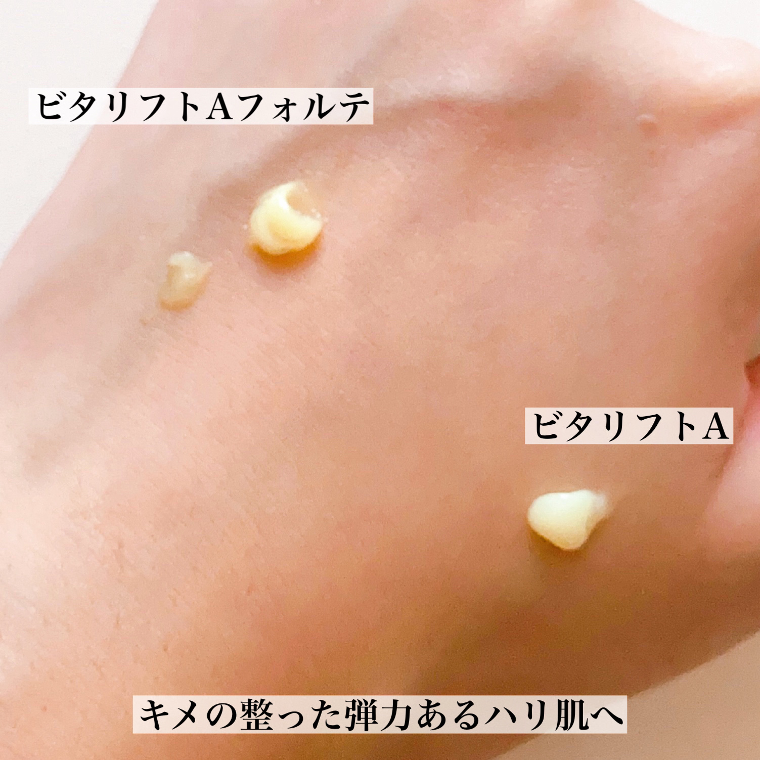 ビタミンレチナール配合 → VITALIFT-Aはレチナールが0.05%配合、VITALIFT-A Forteはレチナールが0.1%配合 特許を受けたリポソーム技術を適用 → 不安定なレチナールを安定化 どちらもなめらかなテクスチャーで伸びが良いクリームで塗った後のしっとりふっくら感がお気に入りです◎