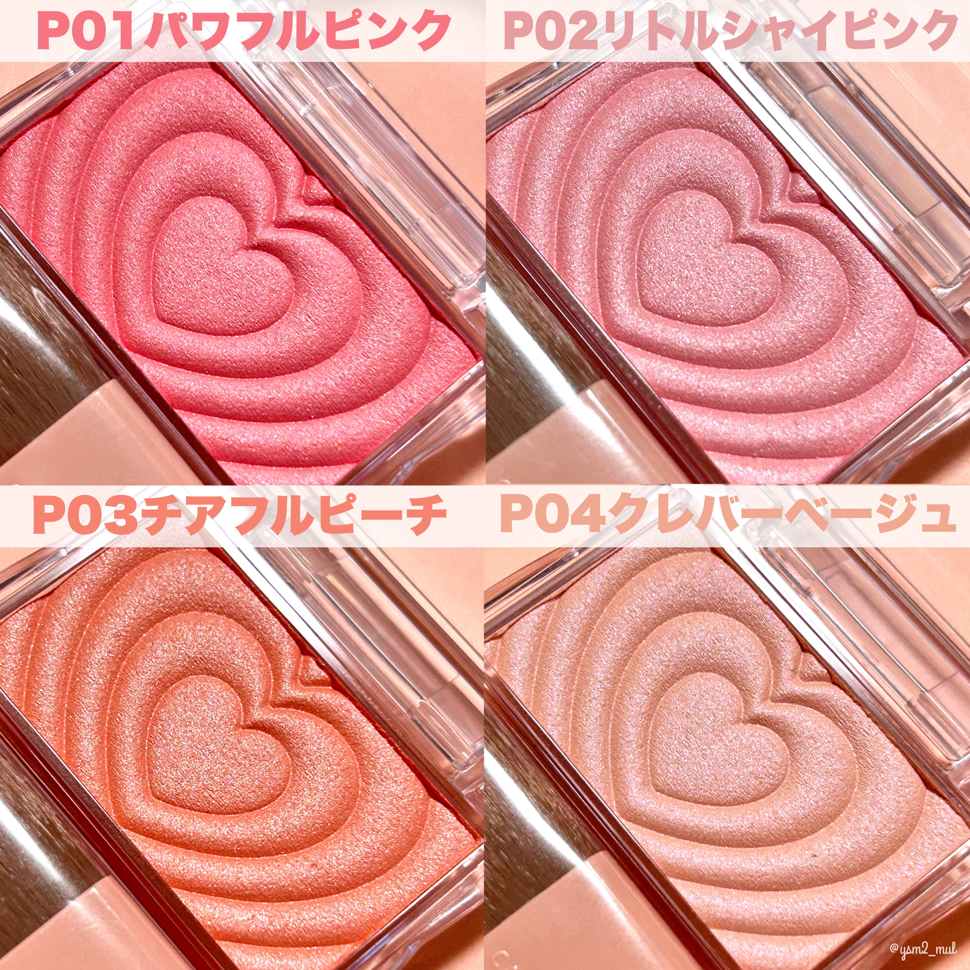 - 生まれ変わった、新・パウダーチークス! クリアな発色でしっとり溶け込むようなツヤ感単色チーク♡ 1.デザインがさらに可愛く♡ 使うたびにキュンとしちゃうハートデザイン♪ 2. 中身がもっと魅力的に ・しっとり感UP!※ ムラになりにくいクリアな発色 ・パール感がさらに繊細に!※ 溶け込むような自然なツヤ感です♪ 3. ブラシの毛量UP※ 広範囲に広げやすいふんわりブラシに進化! ※当社従来品比