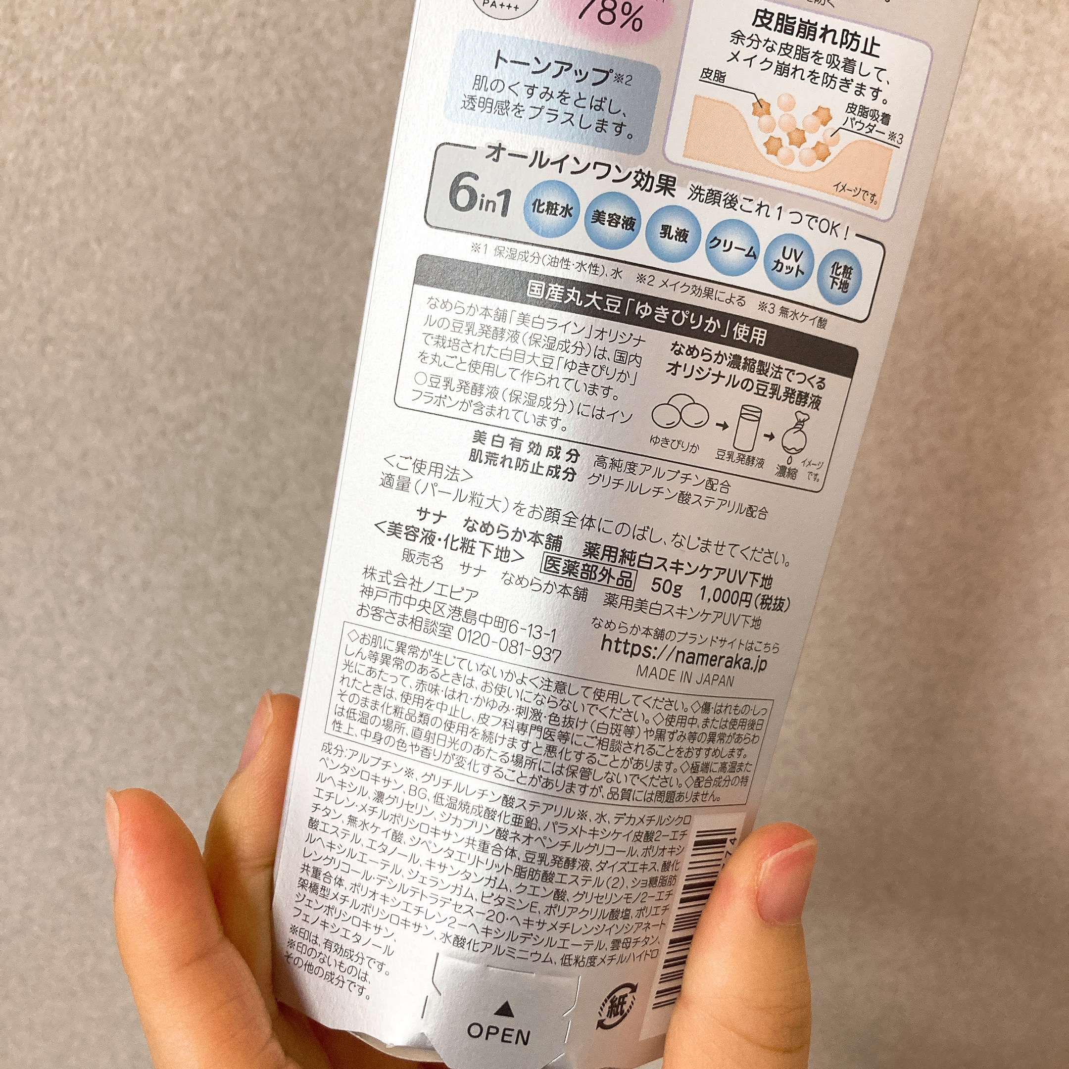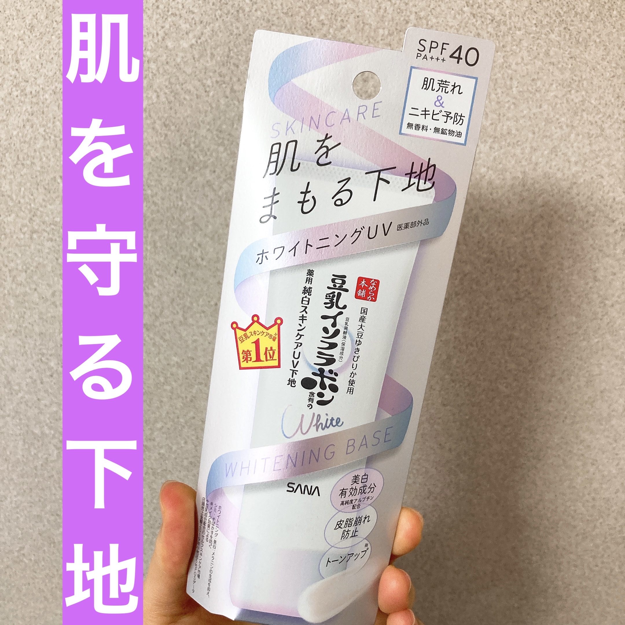 - <薬用美白スキンケアUV下地> 豆乳の美白スキンケアUV下地。肌荒れ&ニキビ予防しながら美白!メラニンの生成を抑え、シミ・そばかすを防ぎます。トーンアップ(メイク効果による)&皮脂崩れ防止。化粧水・美容液・乳液・クリーム・UVカット・化粧下地の1本6役。SPF40・PA+++。[販売名:サナ なめらか本舗 薬用美白スキンケアUV下地]