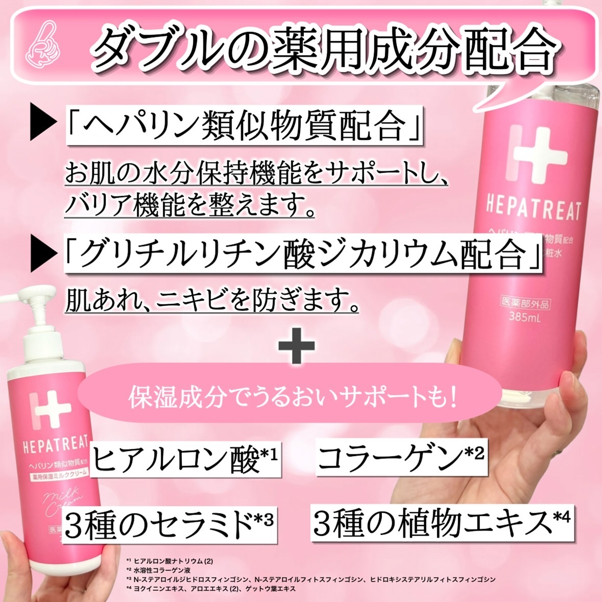 乾燥肌で悩んでる人、マジでおすすめです。 ヘパリン類似物質が配合されたへパトリートの化粧水とミルククリーム。 化粧水はシャバッシャバ系。 ほぼ水みたいなテクスチャーなのに薄く塗るだけで乾燥が気になりにくくなったよ😳 個人的にはダブル使いがおすすめ! 大容量ポンプ式なのも嬉しい!!!