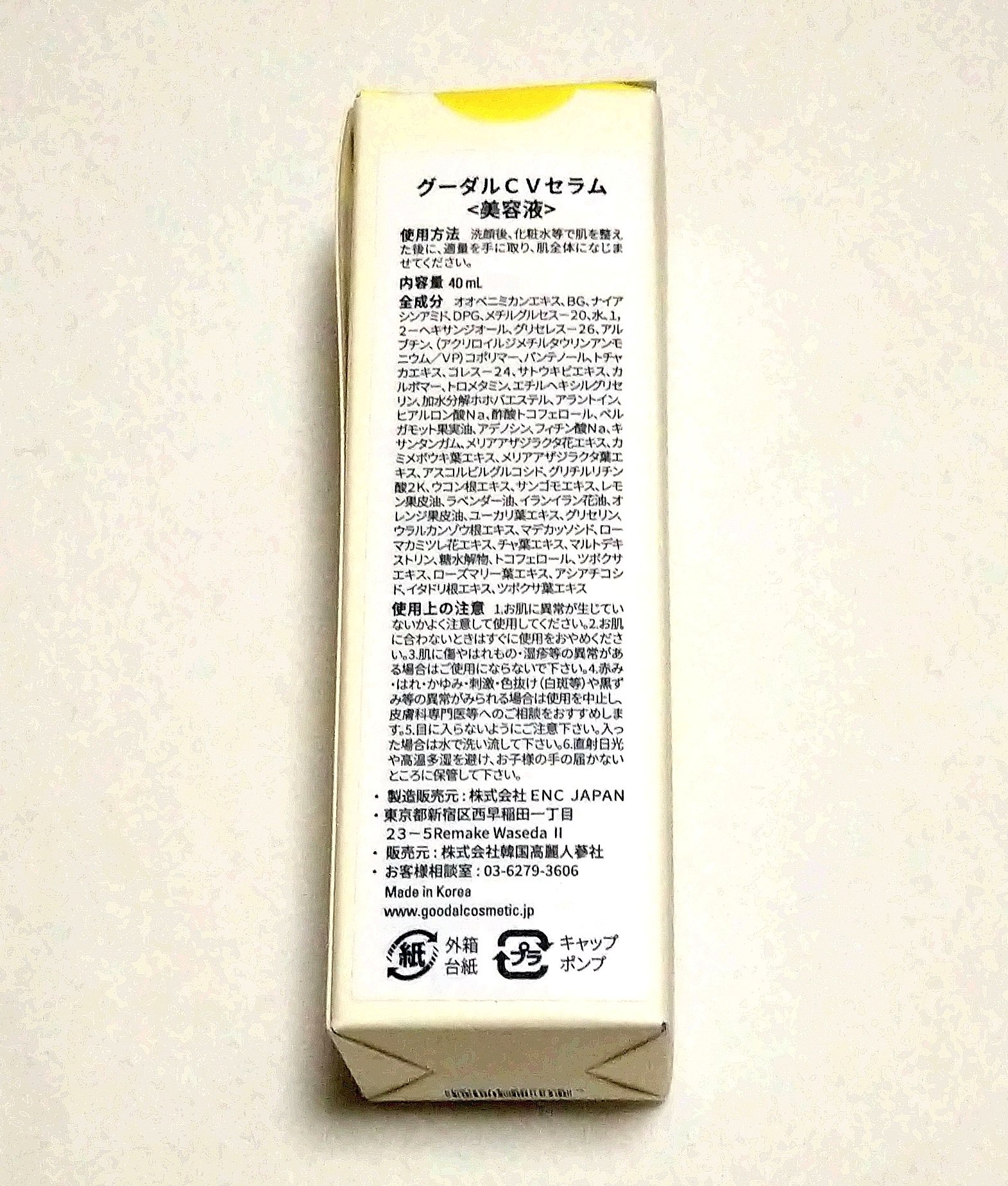 - ◆グーダル グリーンタンジェリンビタCダークスポットケアセラム 40ml 累積販売数:650万個*1 グーダルならではの厳格な基準*2を通過したこだわりの新鮮な済州無農薬青ミカンを直接収穫してAir Bubble Brewing工法で抽出 。生き生きとした印象の肌に。青みかんエキス(タンジェリンエキス)70%配合。乾燥によるくすみをケアし、透明感のある肌に導きます。 お肌のキメを整えるための整肌成分であるビタミンB3(ナイアシンアミド)が既存のグーダルグリーンタンジェリンビタCシミセラムプラスの2倍である4%になりました。 *1:2018.02~2023.09 全チャンネル販売数量基準|リニューアル製品を含む *2:7月中旬から8月中旬の間に獲れたての青ミカンの鮮度を現場ですぐに評価して選別し、超低温で管理、低い温度から直接抽出する青みかんエキス(整肌成分) <酸度>:㏗測定器、リトマス紙使用/酸度3.0~4.0かを確認 <果皮水分含量>:鮮度評価指標で皮の水分含量を測定