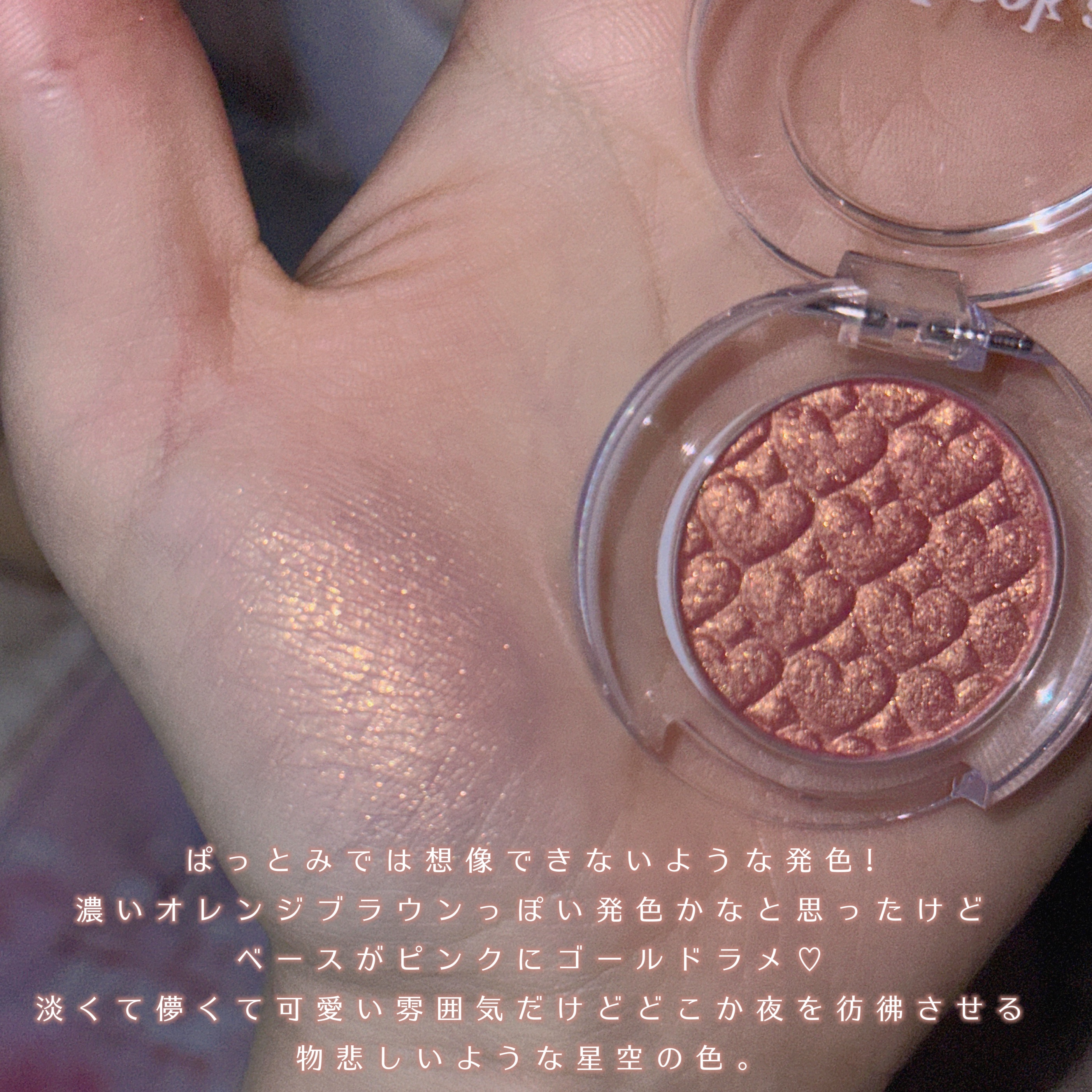 逃避行する少女の瞳に映る夕日のような、儚さと幸せ、そして少しの不幸のような、淡いピンクベースにゴールドラメの可愛さがレベチすぎる♡ルックアットマイアイズ、全色可愛くてどれ買うか迷うし、爆買いしちゃう𐔌՞⸝⸝ʚ̴̶̷̷ · ʚ̴̶̷̷⸝⸝ ՞𐦯