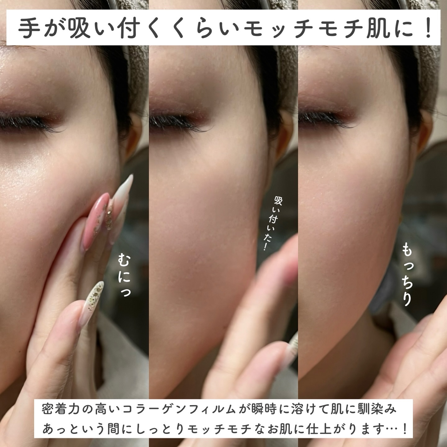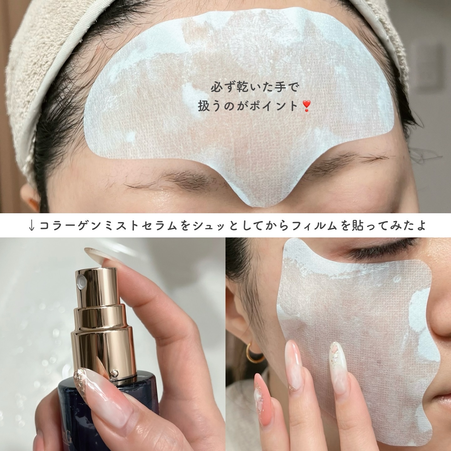 高栄養成分をたっぷり詰め込んだ高機能性ミストセラム✨ オイルミストではないのでベタつかない、トナーではないのですぐ蒸発してしまわないという潤いケアにぴったり😆👍🏻 ブラックスネイルが配合されているので、肌にしっかり栄養を与え、T3コラーゲンという、人が持つコラーゲンに近い成分が肌にハリや弾力を与えてくれるそうです🩷 ニュージーランド産のマリンコラーゲンとヒアルロン酸が配合。 フィルムを貼り付けることで、成分が肌に溶けて角層まで浸透するそうです!