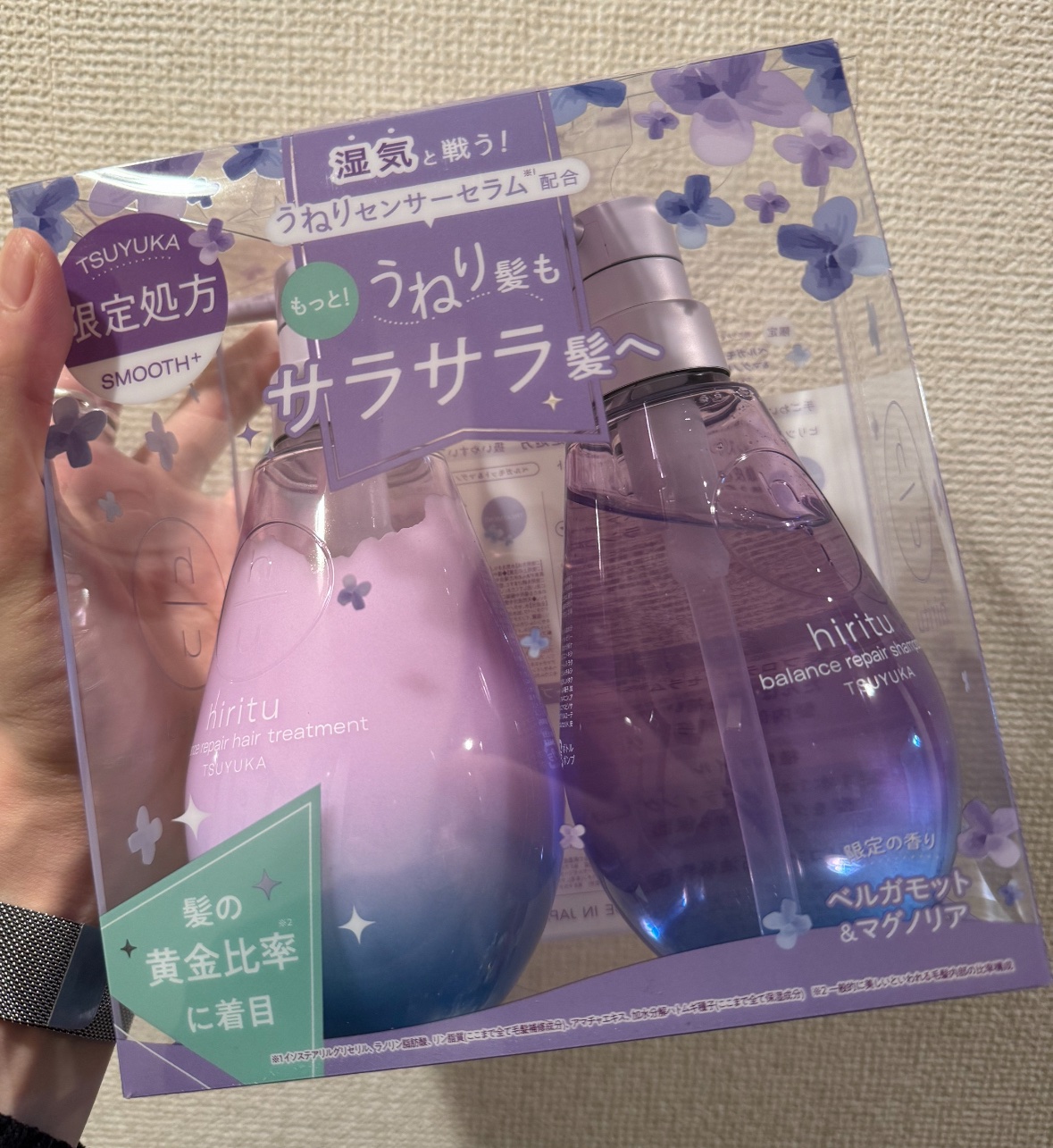 - 〈数量限定〉 ■うねりセンサーセラム※1 髪の水分量をコントロール!うねりの原因の″湿気″に反応しアプローチ イソステアリルグリセリル / ラノリン脂肪酸 / リン脂質 / アマチャエキス / 加水分解ハトムギ種子 【香り】 香水のような高級感と、瑞々しく晴れやかな「ベルガモット&マグノリア」の香り 上品で華やかなフローラルノートをベースに爽やかなベルガモットの香りをプラスした透明感あふれる香り。初夏を感じる、瑞々しい香りでヘアケア時間をお楽しみいただけます。 【限定デザイン】 淡く儚い、「パープル&ブルー」のクリアボトル 雨粒が輝く紫陽花をイメージした、初夏にぴったりの淡いボトルデザインを採用。今だけのhirituをぜひお楽しみください。 ※1 イソステアリルグリセリル、ラノリン脂肪酸、リン脂質(ここまで全て毛髪補修成分)、アマチャエキス、加水分解ハトムギ種子(ここまで全て保湿成分) 2024年5月1日(水)よりECサイト、5月9日(木)より一部バラエティショップ・ドラッグストアで順次販売開始