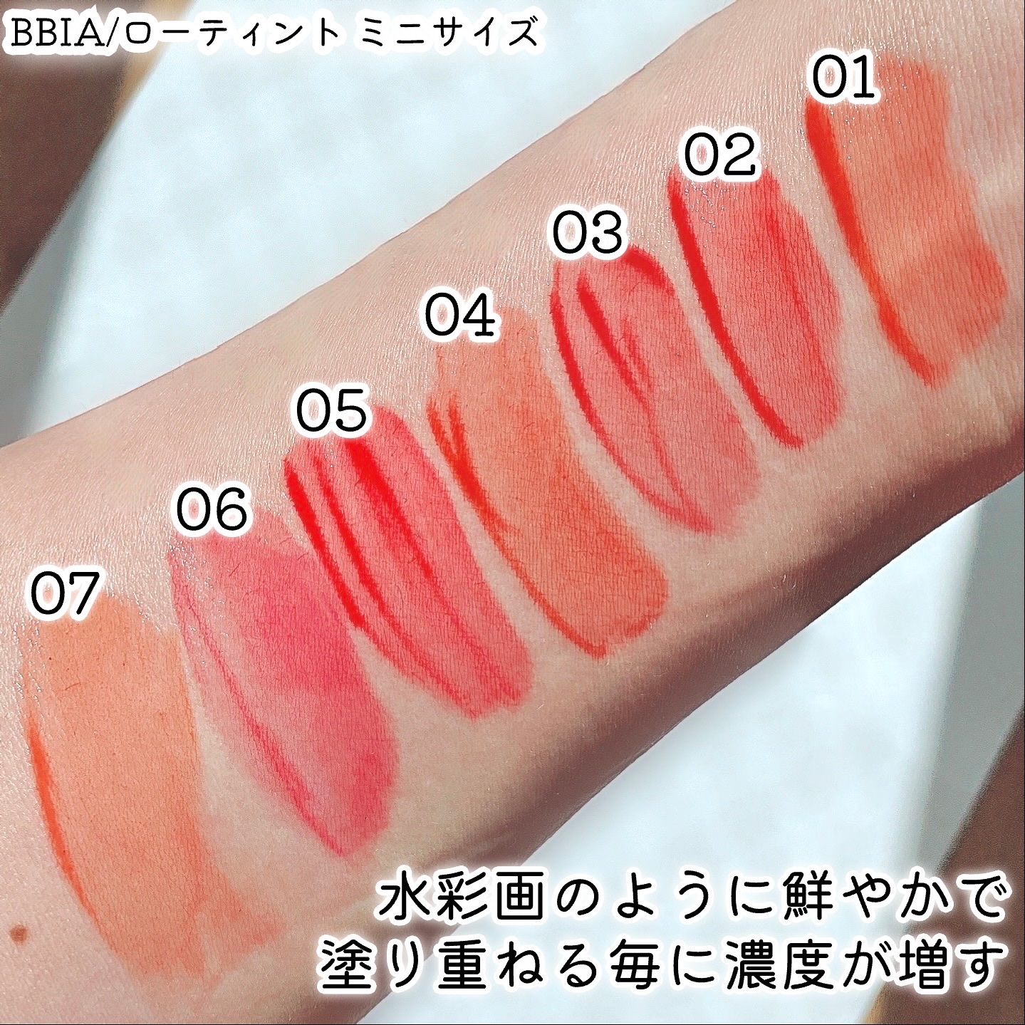 - - うるおいリップなのにしっかりカラーが定着し、時間が経っても塗りたてそのままのカラーを維持 *色が落ちにくいことから「飲み会リップ」としてSNSで話題に - 水のように軽くて快適なグロウティント、塗り重ねるほど鮮やかで透明に浮き上がる水彩画カラー - 香水瓶をイメージしたBBIA初のカスタムデザイン。パッケージはもちろん、カラーとテクスチャーに真心を込めて開発
