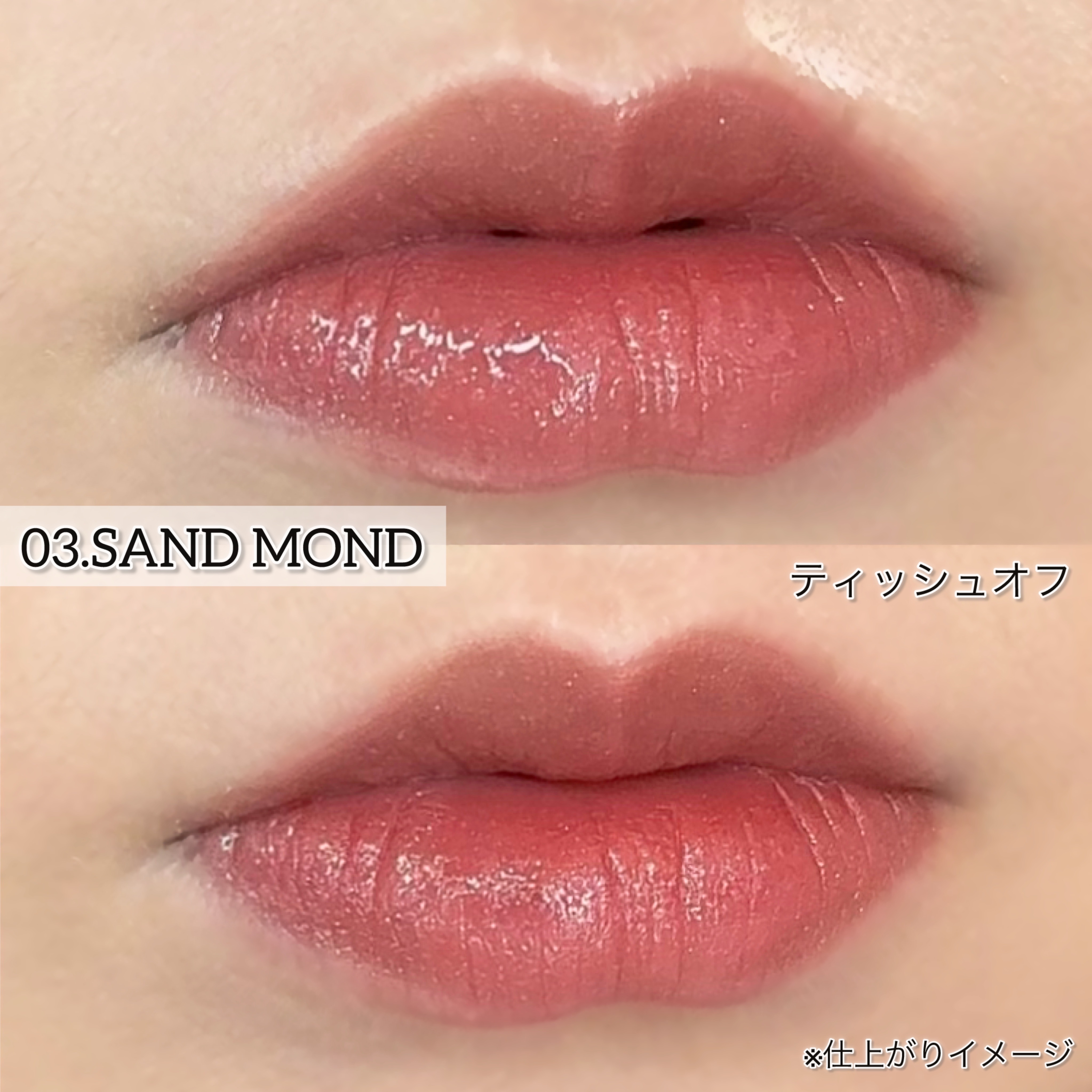 - <01 モーブローズ> リンゴ酸ジイソステアリル、水、ビスジグリセリルポリアシルアジペート-2、ジフェニルシロキシフェニルトリメチコン、トリメチルペンタフェニルトリシロキサン、ジグリセリン、水添ポリイソブテン、グリセリン、ペンチレングリコール、セチルPEG/PPG-10/1ジメチコン、イソステアリン酸ソルビタン、セテアレス-20、フェノキシエタノール、(アクリル酸ヒドロキシエチル/アクリロイルジメチルタウリンNa)コポリマー、スクワラン、クロレラエキス、グルコース、BG、香料、フルクトオリゴ糖、フルクトース、ジラウラミドグルタミドリシンNa、エチルヘキシルグリセリン、ポリソルベート60、エチレンジアミンジコハク酸3Na、水酸化Al、ポリアクリル酸アンモニウム、1,2-ヘキサンジオール、テトラ(ジ-t-ブチルヒドロキシヒドロケイヒ酸)ペンタエリスリチル、パルミチン酸エチルヘキシル、マルトデキストリン、アボカドエキス、トリベヘニン、パルミチン酸スクロース、水添レシチン、マカデミア種子油、オリーブ果実油、ホホバ種子油、ブドウ種子油、乳酸、パルミトイルトリペプチド-1 [+/-]酸化チタン、ホウケイ酸(Ca/チタン)、酸化スズ、黄4、黄5、赤104(1)、赤227、青1 <02 メリーコーラル> リンゴ酸ジイソステアリル、水、ビスジグリセリルポリアシルアジペート-2、ジフェニルシロキシフェニルトリメチコン、トリメチルペンタフェニルトリシロキサン、ジグリセリン、水添ポリイソブテン、グリセリン、ペンチレングリコール、セチルPEG/PPG-10/1ジメチコン、イソステアリン酸ソルビタン、セテアレス-20、フェノキシエタノール、(アクリル酸ヒドロキシエチル/アクリロイルジメチルタウリンNa)コポリマー、スクワラン、クロレラエキス、グルコース、BG、香料、フルクトオリゴ糖、フルクトース、ジラウラミドグルタミドリシンNa、エチルヘキシルグリセリン、ポリソルベート60、エチレンジアミンジコハク酸3Na、水酸化Al、ポリアクリル酸アンモニウム、1,2-ヘキサンジオール、テトラ(ジ-t-ブチルヒドロキシヒドロケイヒ酸)ペンタエリスリチル、パルミチン酸エチルヘキシル、マルトデキストリン、アボカドエキス、トリベヘニン、パルミチン酸スクロース、水添レシチン、マカデミア種子油、オリーブ果実油、ホホバ種子油、ブドウ種子油、乳酸、パルミトイルトリペプチド-1 [+/-]酸化チタン、ホウケイ酸(Ca/チタン)、酸化スズ、黄4、黄5、赤104(1)、赤227、青1 <03 サンドモンド> リンゴ酸ジイソステアリル、水、ビスジグリセリルポリアシルアジペート-2、ジフェニルシロキシフェニルトリメチコン、トリメチルペンタフェニルトリシロキサン、ジグリセリン、水添ポリイソブテン、グリセリン、ペンチレングリコール、セチルPEG/PPG-10/1ジメチコン、イソステアリン酸ソルビタン、セテアレス-20、フェノキシエタノール、(アクリル酸ヒドロキシエチル/アクリロイルジメチルタウリンNa)コポリマー、スクワラン、クロレラエキス、グルコース、BG、香料、フルクトオリゴ糖、フルクトース、ジラウラミドグルタミドリシンNa、エチルヘキシルグリセリン、ポリソルベート60、エチレンジアミンジコハク酸3Na、水酸化Al、ポリアクリル酸アンモニウム、1,2-ヘキサンジオール、テトラ(ジ-t-ブチルヒドロキシヒドロケイヒ酸)ペンタエリスリチル、パルミチン酸エチルヘキシル、マルトデキストリン、アボカドエキス、トリベヘニン、パルミチン酸スクロース、水添レシチン、マカデミア種子油、オリーブ果実油、ホホバ種子油、ブドウ種子油、乳酸、パルミトイルトリペプチド-1 [+/-]酸化チタン、ホウケイ酸(Ca/チタン)、酸化スズ、黄4、黄5、赤104(1)、赤227、青1 <04 フィグピーチ> リンゴ酸ジイソステアリル、水、ビスジグリセリルポリアシルアジペート-2、ジフェニルシロキシフェニルトリメチコン、トリメチルペンタフェニルトリシロキサン、ジグリセリン、水添ポリイソブテン、グリセリン、ペンチレングリコール、セチルPEG/PPG-10/1ジメチコン、イソステアリン酸ソルビタン、セテアレス-20、フェノキシエタノール、(アクリル酸ヒドロキシエチル/アクリロイルジメチルタウリンNa)コポリマー、スクワラン、クロレラエキス、グルコース、BG、香料、フルクトオリゴ糖、フルクトース、ジラウラミドグルタミドリシンNa、エチルヘキシルグリセリン、ポリソルベート60、エチレンジアミンジコハク酸3Na、水酸化Al、ポリアクリル酸アンモニウム、1,2-ヘキサンジオール、テトラ(ジ-t-ブチルヒドロキシヒドロケイヒ酸)ペンタエリスリチル、パルミチン酸エチルヘキシル、マルトデキストリン、アボカドエキス、トリベヘニン、パルミチン酸スクロース、水添レシチン、マカデミア種子油、オリーブ果実油、ホホバ種子油、ブドウ種子油、乳酸、パルミトイルトリペプチド-1 [+/-]酸化チタン、ホウケイ酸(Ca/チタン)、酸化スズ、黄4、黄5、赤104(1)、赤227、青1 <05 スコッチショット> リンゴ酸ジイソステアリル、水、ビスジグリセリルポリ