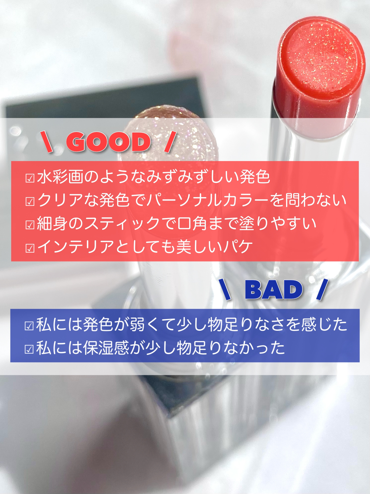 ベタつきが無くするする~っと塗れます💄 ちゅるんとしたキラキラぷっくりがとっても可愛らしい印象に♪ 発色は水彩画のような透き通ったシアーでナチュラルなメイクからしっかりメイクまで肌色を引き立てながらちゅるんとした保湿感が高い水光リップ💕 塗ってから少し時間経つと、密着感と発色が良くなるよ🫶 パッケージがとってもオシャレで高級感!
