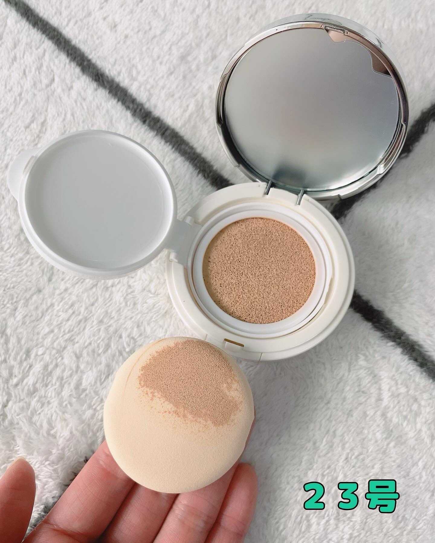 色味は21.ライトベージュイエローベージュで肌馴染み良く明るくみせてくれます 仕上がりは艶感のある瑞々しい感じです🩵 ツヤ&保湿に優れたCICA成分たっぷりのスキンケア感覚で使用出来るクッションファンデです