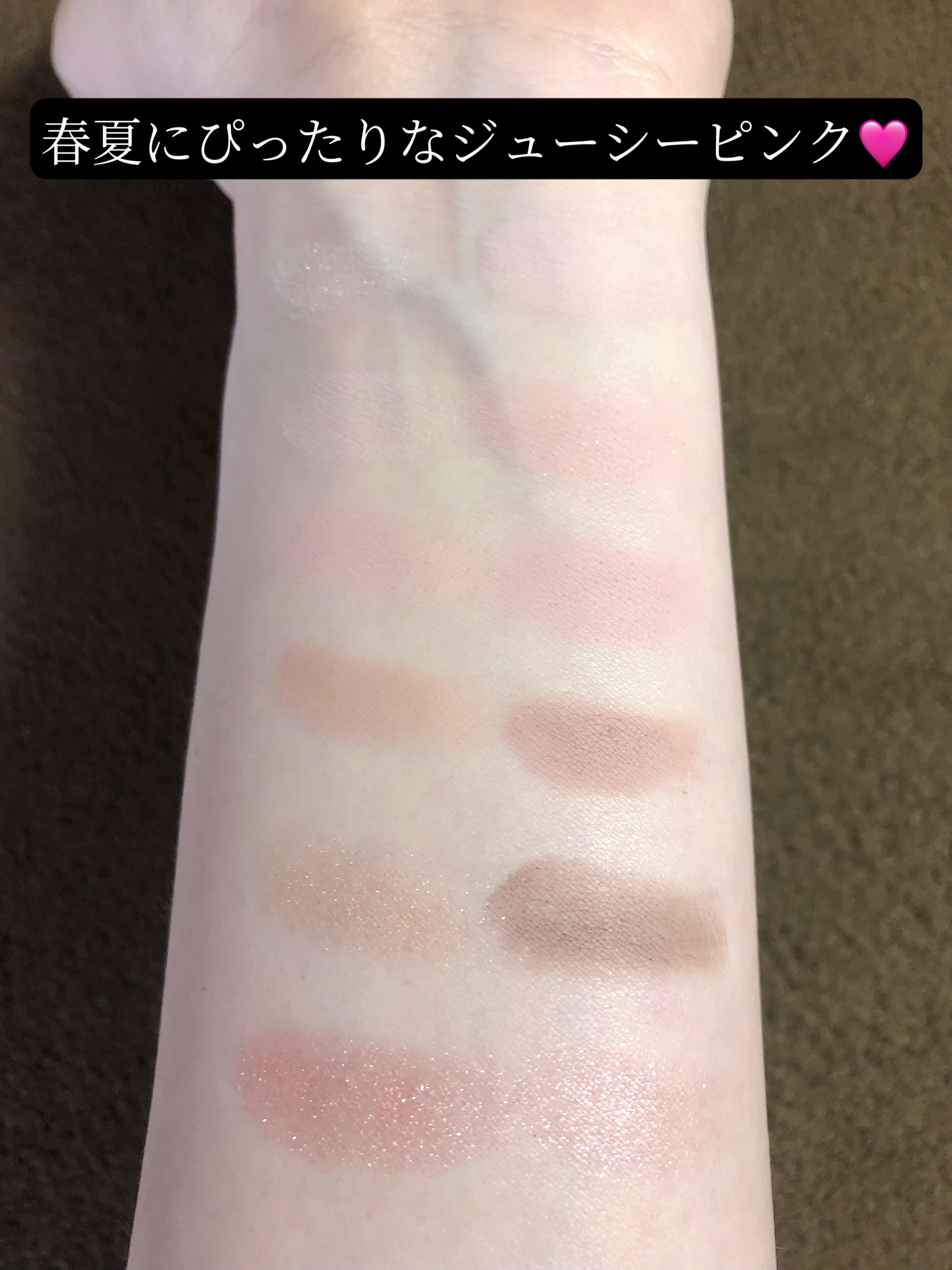 色味が公式と違う感じがしました。公式だとニュートラルなローズピンクという印象でしたが、実際に腕に出してみるとオレンジピンクな色味。 ラメは繊細な輝きで美しく、密着力がありました!ラメだけ単体で発売して欲しいくらい。 私個人としては合わなかったというだけなので、ご参考までに。