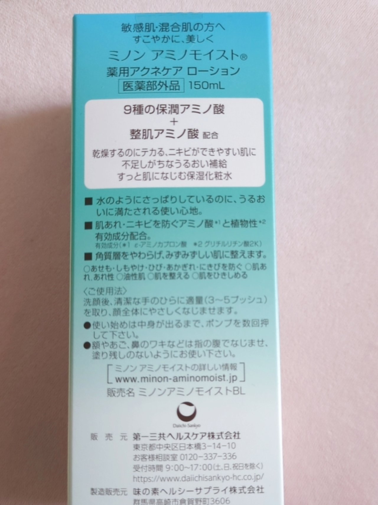 - 乾燥もテカりも気になる肌にすっとなじんでうるおい補給 水のようにさっぱりしているのに、うるおいに満たされる使い心地。 肌あれ・ニキビを防ぐアミノ酸※1と植物性※2有効成分配合。 角質層をやわらげ、みずみずしい肌に整えます。 1.洗顔後、清潔な手のひらに適量(3~5プッシュ)を取ります。 2.顔全体にやさしくなじませます。 *使い始めは中身が出るまで、ポンプを数回押してください。 *中身が出しにくい時は、ポンプの向きを変えて、数回プッシュしてください。 販売名:ミノンアミノモイストBL[医薬部外品]