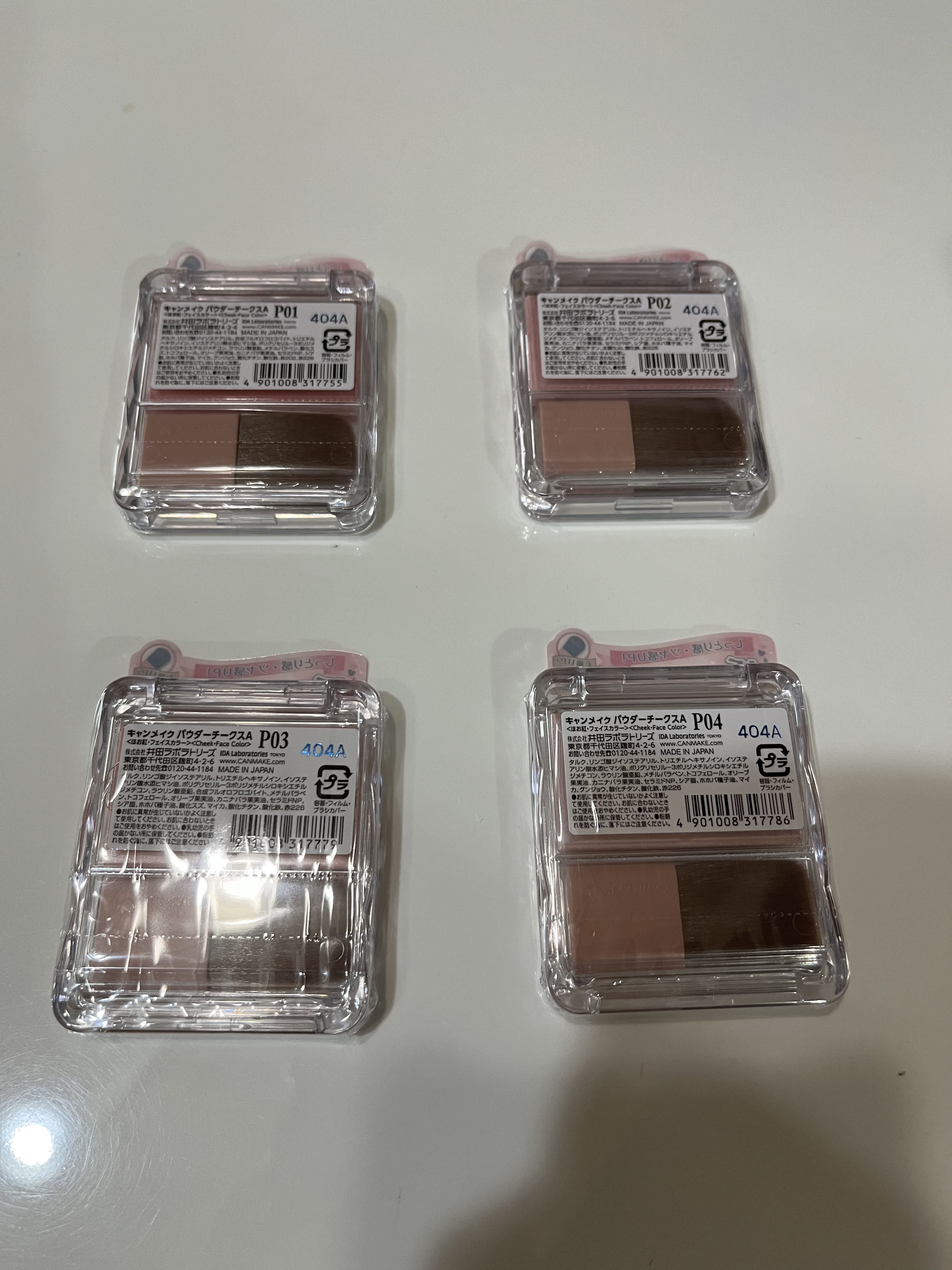 - <P01 パワフルピンク> タルク、リンゴ酸ジイソステアリル、合成フルオロフロゴパイト、トリエチルヘキサノイン、イソステアリン酸水添ヒマシ油、ポリグリセリル-3ポリジメチルシロキシエチルジメチコン、ラウリン酸亜鉛、メチルパラベン、酸化スズ、トコフェロール、オリーブ果実油、カニナバラ果実油、セラミドNP、シア脂、ホホバ種子油、マイカ、グンジョウ、酸化チタン、酸化鉄、赤202、赤226 <P02 リトルシャイピンク> タルク、リンゴ酸ジイソステアリル、トリエチルヘキサノイン、イソステアリン酸水添ヒマシ油、ポリグリセリル-3ポリジメチルシロキシエチルジメチコン、ラウリン酸亜鉛、メチルパラベン、トコフェロール、オリーブ果実油、カニナバラ果実油、セラミドNP、シア脂、ホホバ種子油、マイカ、グンジョウ、酸化チタン、水酸化Al、酸化鉄、赤226 <P03 チアフルピーチ> タルク、リンゴ酸ジイソステアリル、トリエチルヘキサノイン、イソステアリン酸水添ヒマシ油、ポリグリセリル-3ポリジメチルシロキシエチルジメチコン、ラウリン酸亜鉛、合成フルオロフロゴパイト、メチルパラベン、トコフェロール、オリーブ果実油、カニナバラ果実油、セラミドNP、シア脂、ホホバ種子油、酸化スズ、マイカ、酸化チタン、酸化鉄、赤226 <P04 クレバーベージュ> タルク、リンゴ酸ジイソステアリル、トリエチルヘキサノイン、イソステアリン酸水添ヒマシ油、ポリグリセリル-3ポリジメチルシロキシエチルジメチコン、ラウリン酸亜鉛、メチルパラベン、トコフェロール、オリーブ果実油、カニナバラ果実油、セラミドNP、シア脂、ホホバ種子油、マイカ、グンジョウ、酸化チタン、酸化鉄、赤226 <P05 クラッシーモーヴピンク> タルク、リンゴ酸ジイソステアリル、トリエチルヘキサノイン、イソステアリン酸水添ヒマシ油、ポリグリセリル-3ポリジメチルシロキシエチルジメチコン、ラウリン酸亜鉛、メチルパラベン、トコフェロール、オリーブ果実油、カニナバラ果実油、セラミドNP、シア脂、ホホバ種子油、マイカ、酸化鉄、酸化チタン、水酸化Al、グンジョウ、赤226 <P40thx キューティーベリー> タルク、リンゴ酸ジイソステアリル、トリエチルヘキサノイン、イソステアリン酸水添ヒマシ油、合成フルオロフロゴパイト、ポリグリセリル-3ポリジメチルシロキシエチルジメチコン、ラウリン酸亜鉛、メチルパラベン、トコフェロール、オリーブ果実油、カニナバラ果実油、セラミドNP、シア脂、ホホバ種子油、マイカ、酸化チタン、赤226、グンジョウ、酸化鉄、水酸化Al