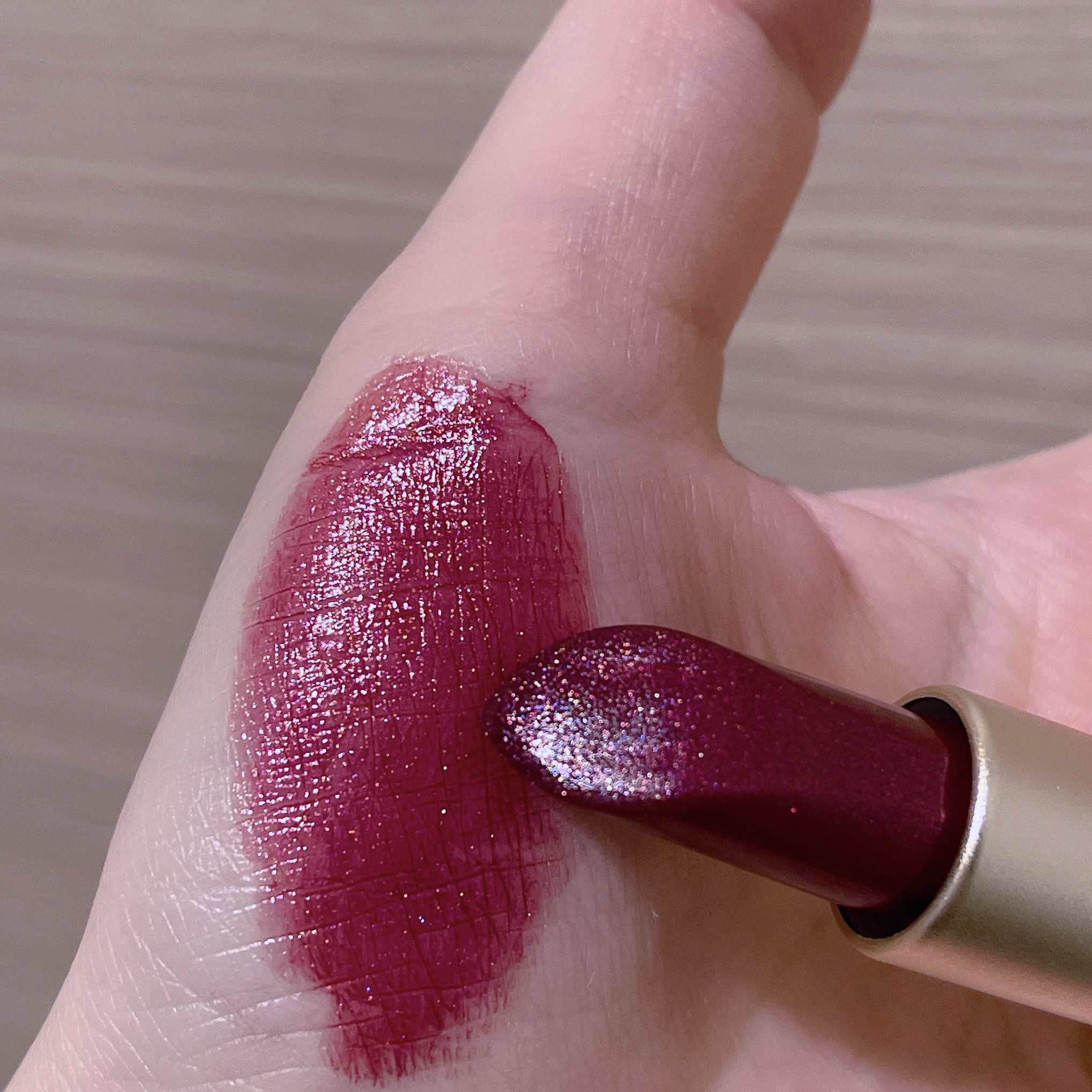 爆裂ラメ煌めく大人プラムリップ🍇 シアーで青みの効いたプラムレッドにたっぷりのレッド、ブルーのパウダーが輝くリップスティック。 一度塗りだとシアーで軽さのあるプラムピンク、重ね塗りだと深みのあるプラムレッドにブルベ冬の秋冬リップにイチオシ🫶 ブルベ冬の秋冬メイクに◎