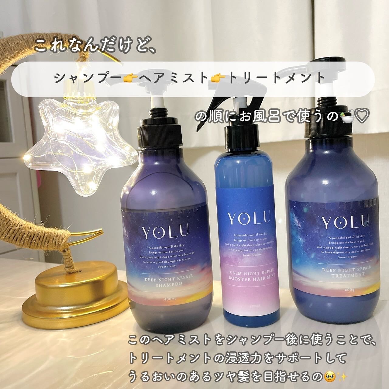 𓂃𓈒𓏸YOLU𓂃𓈒𓏸˗ˏˋカームナイトリペアブースターヘアミスト ˎˊ˗このヘアミストはなんと2WAYで使用が可能🤍普段の髪の毛の広がり、パサつき、朝の寝ぐせ直し用のヘアケア用品としてだけでなく、お風呂でシャンプー後のトリートメント前の導入美...