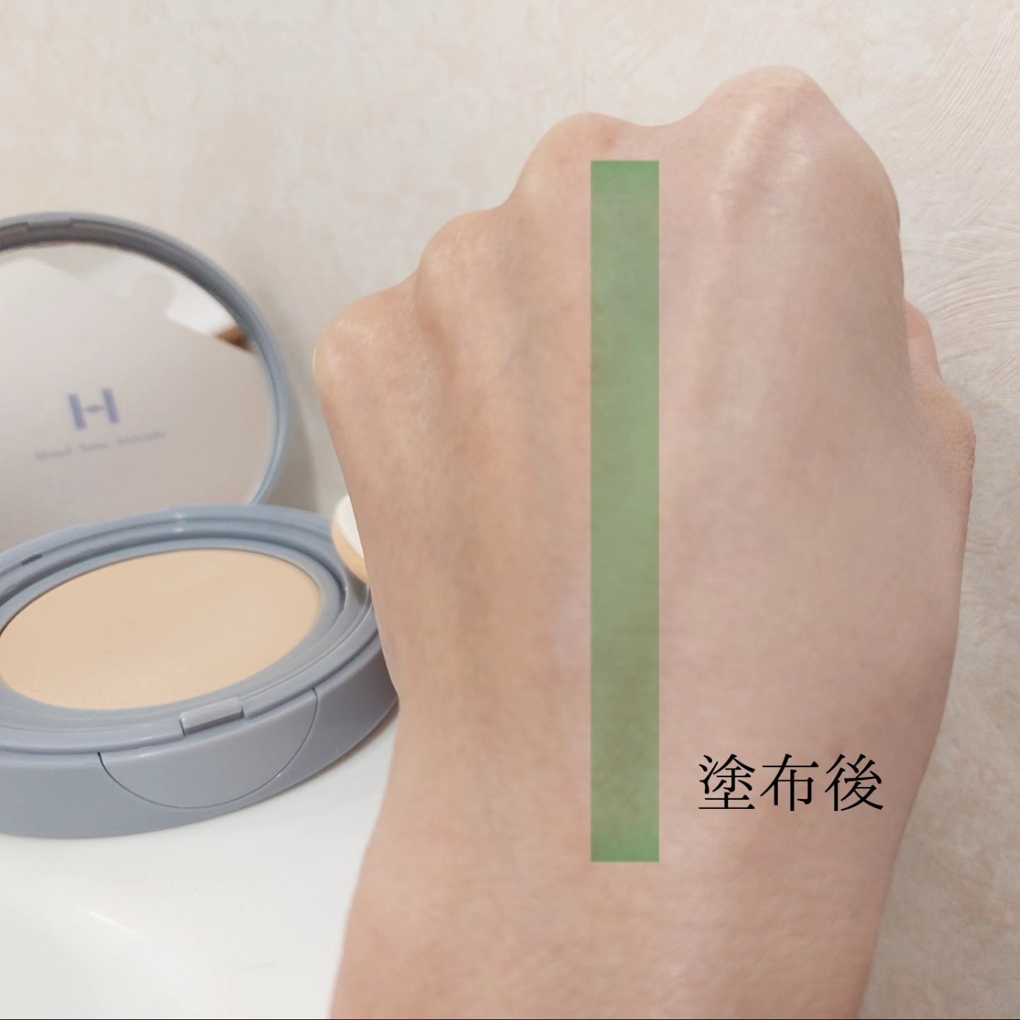 もちっとしたジェリーテクスチャーは、しっとりとした質感で粉っぽくないので指塗りしやすく、ポイントカラーも重ねやすい。 左のベースカラーは淡めの発色。 右のポイントカラーは見ためほど濃くならずにこちらも淡め。