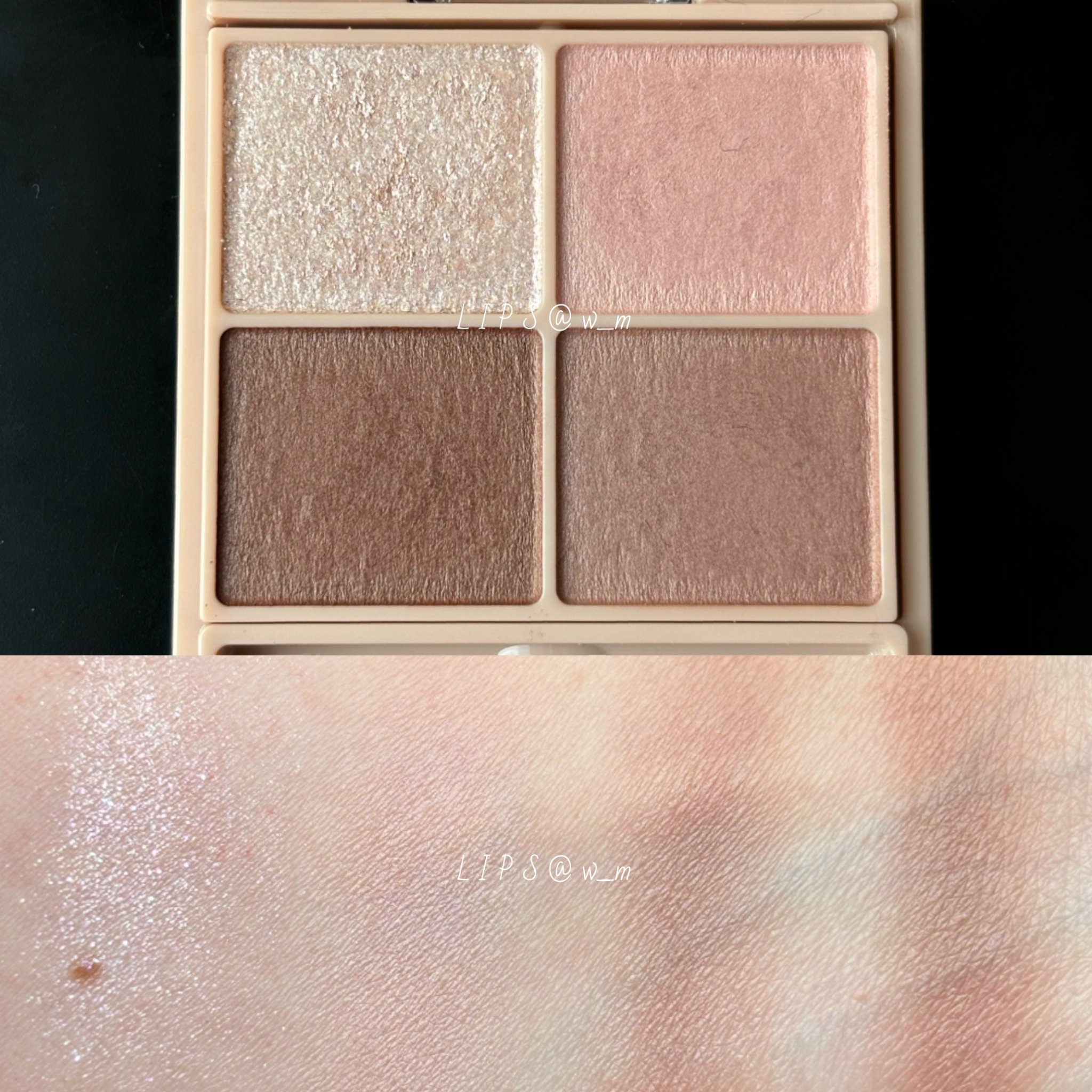 全体的に見た目より柔らかいシアー感のある発色 メインカラー+ラメ/メインカラー+締め色/上段左右→下段右/上段左→下段左右と好きなように使える配色なのも◎ 左上はかなりはっきりしたラメカラー 公式ではアイホール全体に入れるよう推奨してたけど、流石に派手過ぎたので今回は割愛しました しっとりテクスチャだけど細いブラシだとボソボソとまとまって取れるので、小指でささっと塗るのが粉飛びせず1番安心して使えるかも