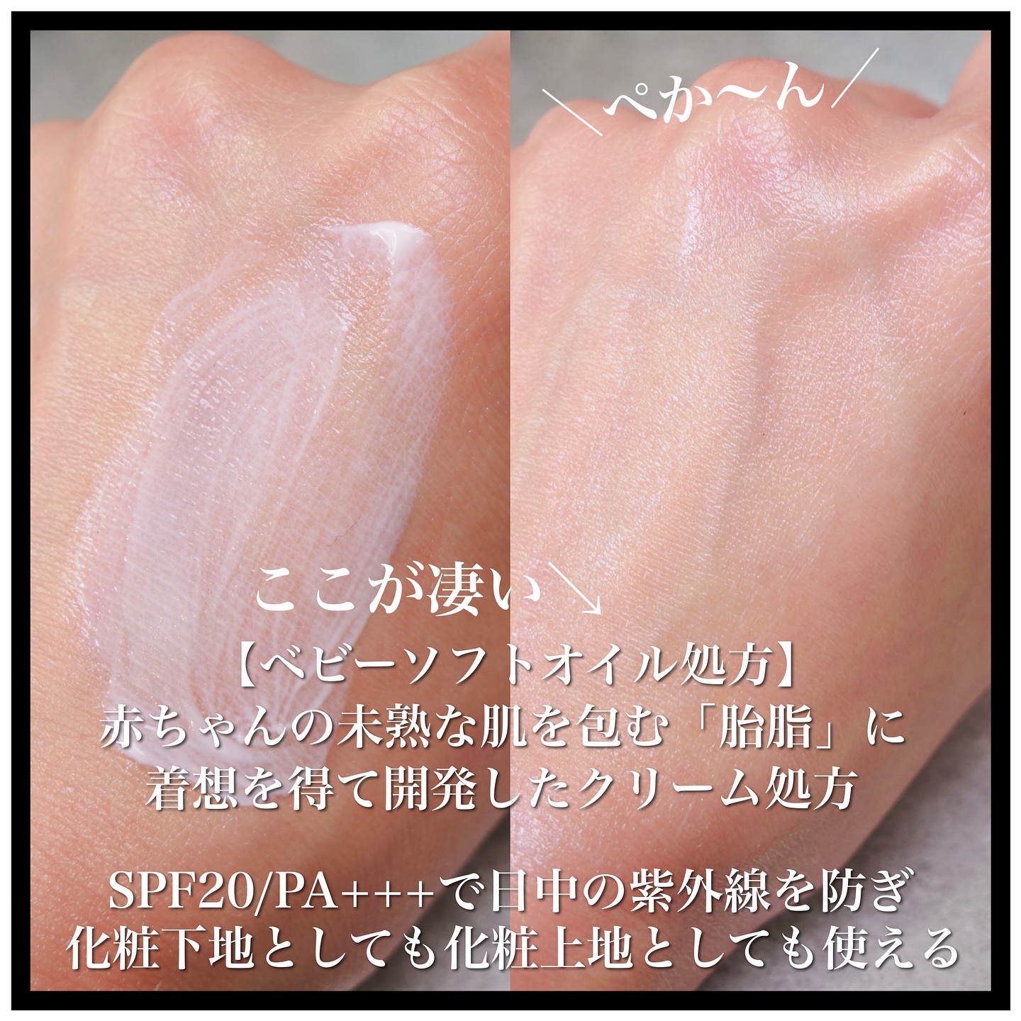 - SPF20・PA+++ 今日の美しさを高める、朝クリーム。日中の乾燥や紫外線から肌を守り、長時間うるおい続け、内側からにじみ出るような自然なツヤを演出。メイクのりを高める下地としてだけでなく、ツヤを与える化粧上地としても。未熟な赤ちゃんを包む「胎脂」に着想を得て開発した「ベビーソフトオイル処方」採用。「ティートピア」をアクセントに、朝のみずみずしい緑と花々をイメージしたフレッシュフローラルの香り。