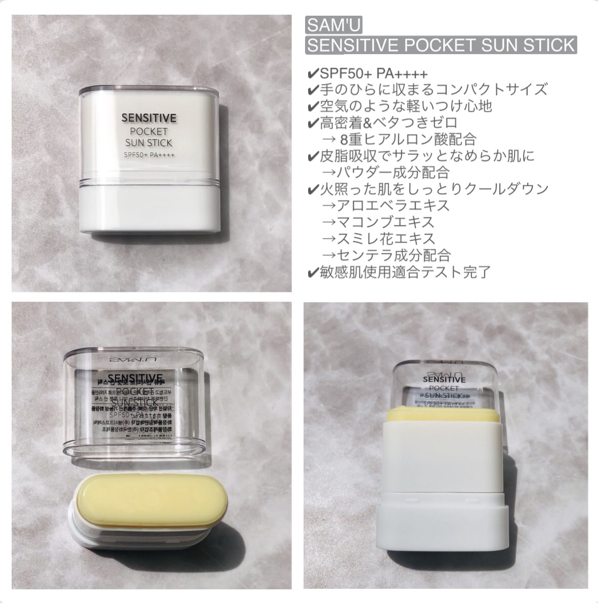 \しっかり強力UVをブロック/サミュのセンシティブポケットサンスティックを愛用中🌟軽量&縦横約5cmのポケットサイズのコンパクトさでフェイスやボディへいつでもどこでも簡単密着サンケアできます◎アロエベラエキス・マコンブエキス・スミレ花エキスを...