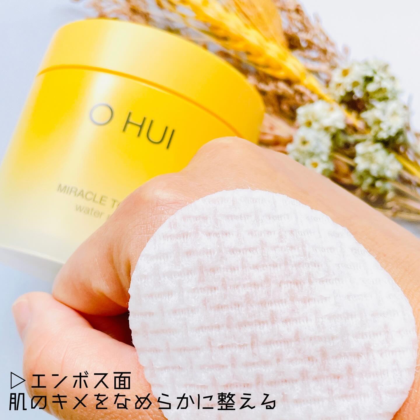 OHUIの人気ライン"ミラクルトーニング"のトナーパッド💛 エンボスパターン面は、柔らかく吸い取って肌のキメをなめらかに整えてくれるそう📝 みずみずしく爽やかな使い心地💎 ベタつきもないので、朝のメイク前の使用にもおすすめ🌸
