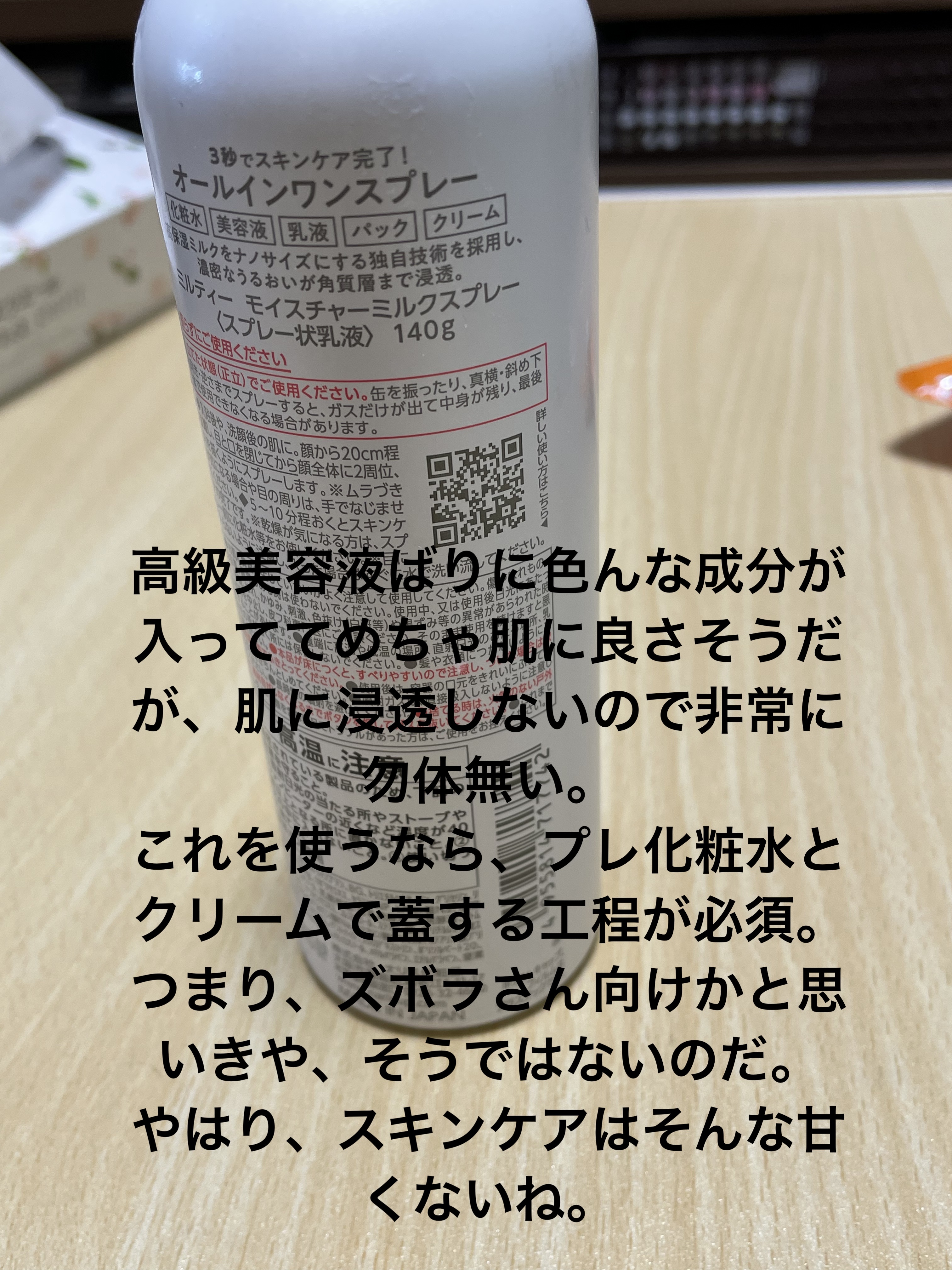 オールインワンって便利ですよね! ギリギリまで寝ていたい朝とか、疲れて早く寝たい夜とか。 これは勢いも強くないし、スプレーの細かさなのか、肌に当たった感じも柔らかい! 何より、レモンの香りがすっきりしていて好みです🍋 乳液特有のベタつきが苦手なのですが、それも強くない。