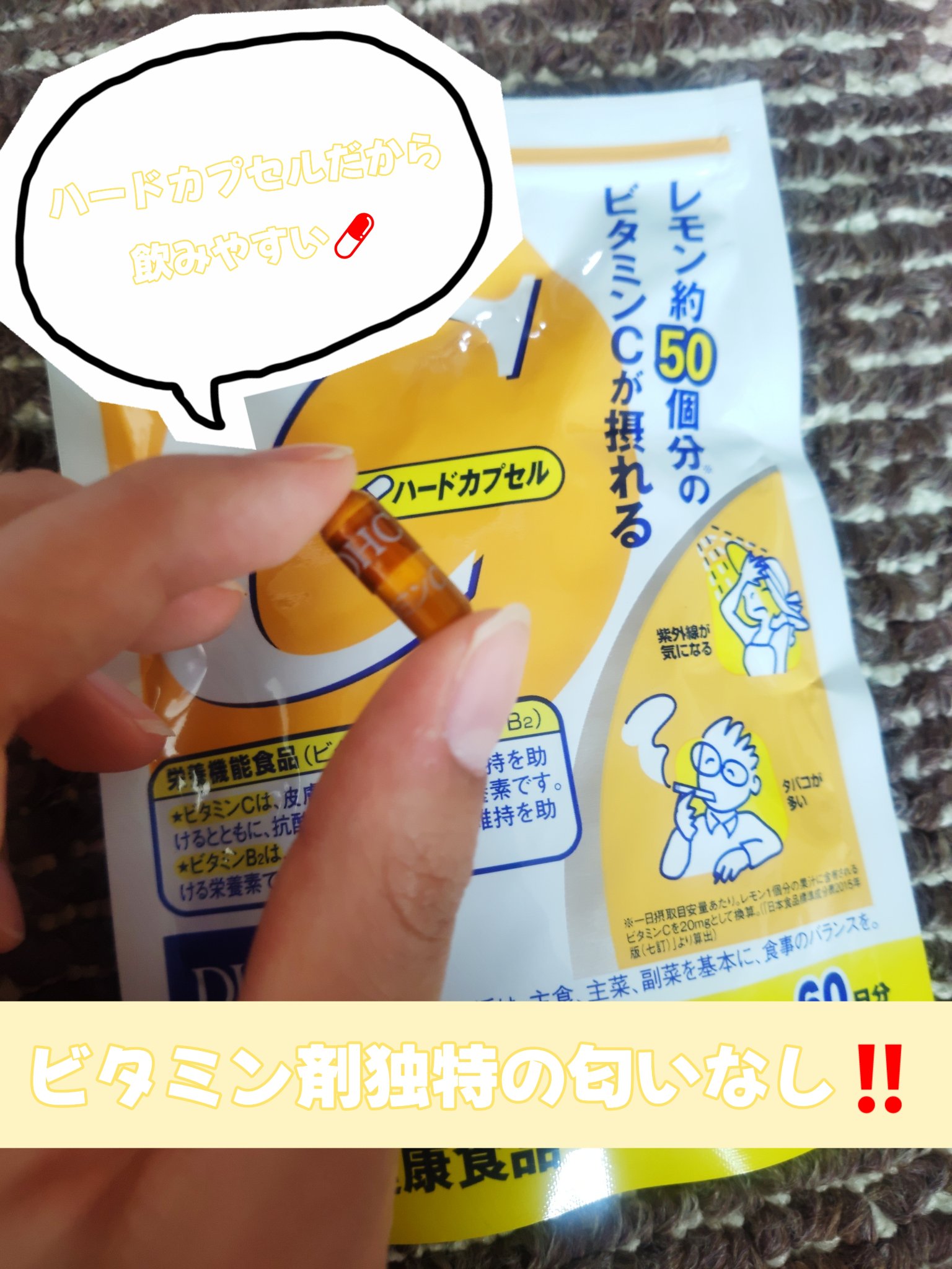 - ビタミンC、ゼラチン、着色料(カラメル、酸化チタン)、ビタミンB2